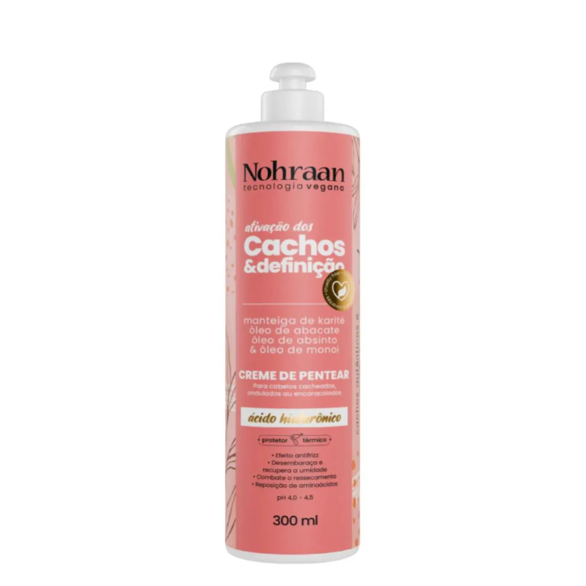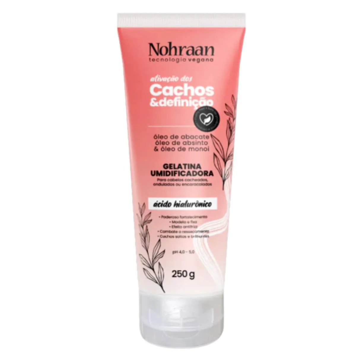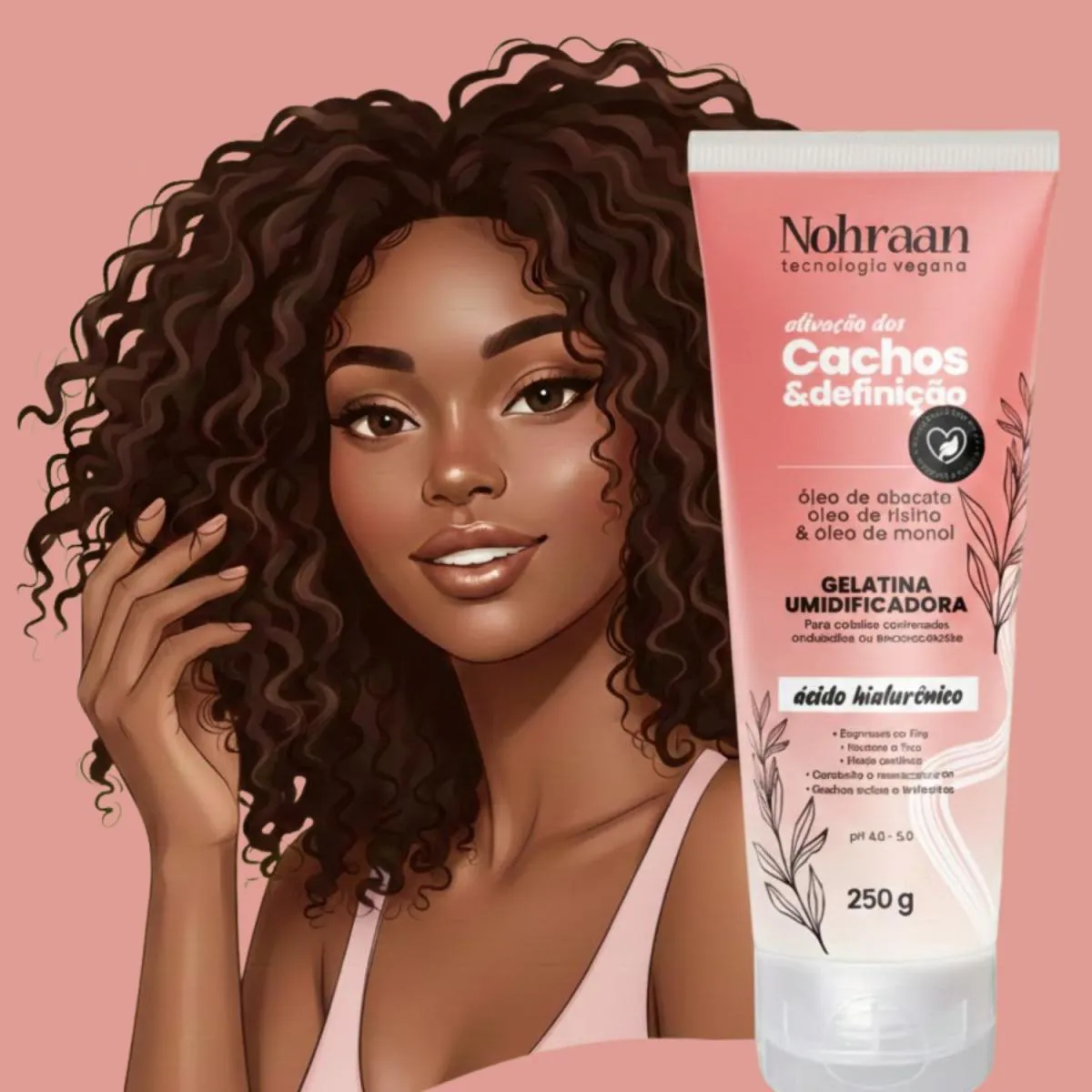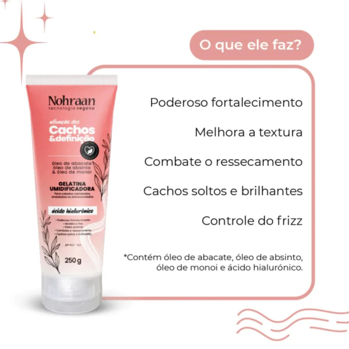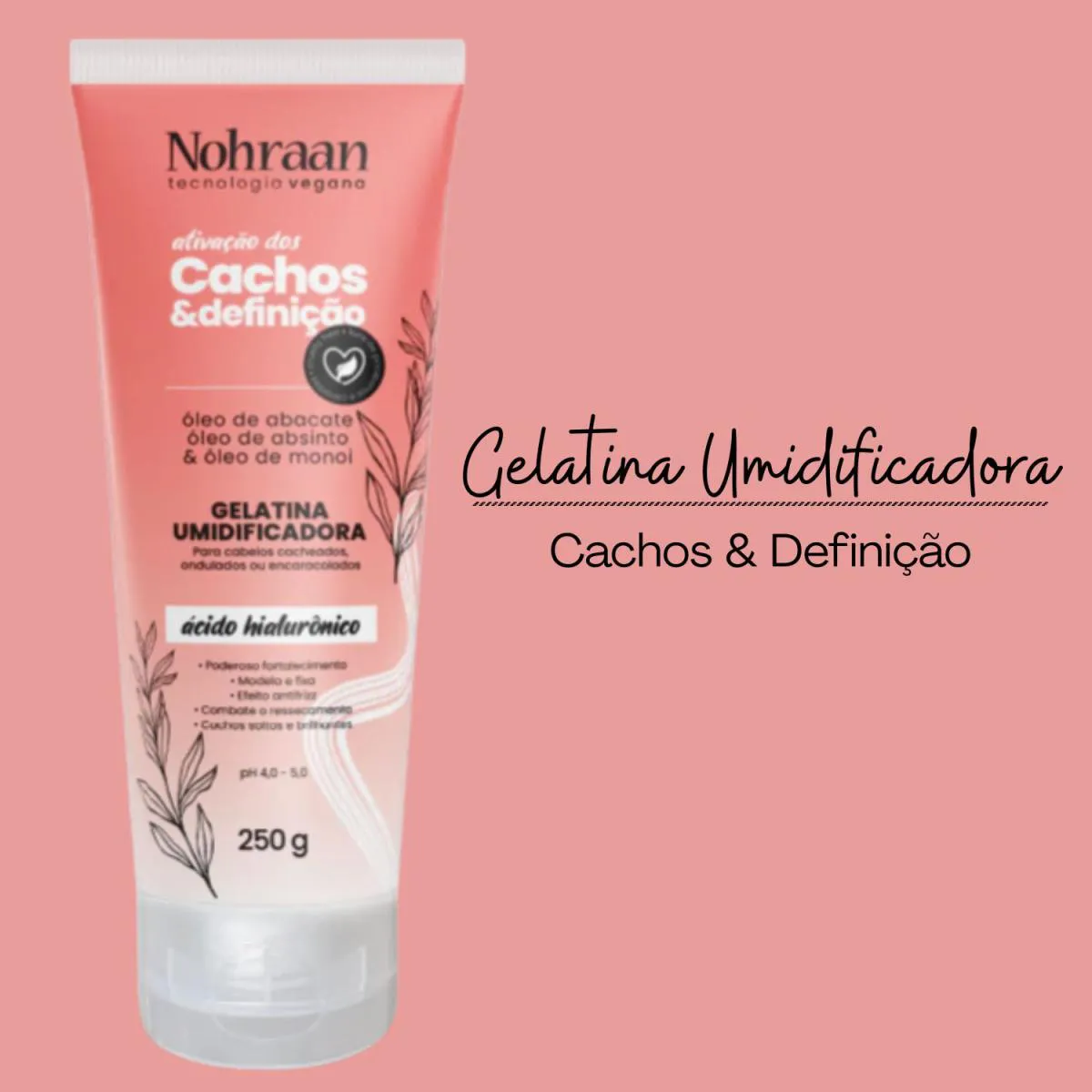 O kit é composto por uma Gelatina Umidificadora e um creme de pentear, ambos da linha Cachos Abacate & Absinto da marca Nohraan, desenvolvidos especificamente para cabelos cacheados.