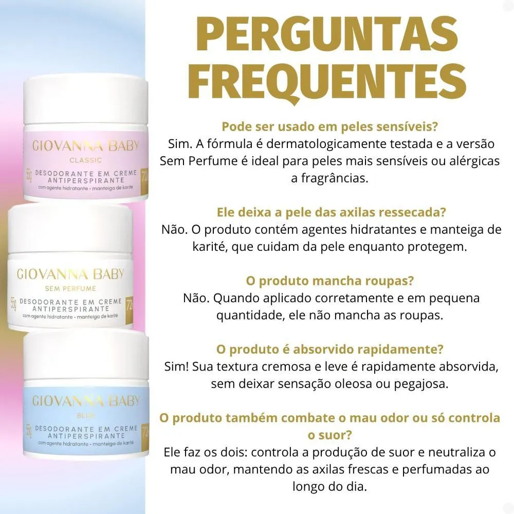 Marca: GIOVANNA BABYCategoria: Higiene Pessoal, DesodorantesTipo de Formulação: CremeQuantidade no Kit: 3 unidadesDuração da Proteção: até 72 horasTestado Dermatologicamente: SimCruelty-Free: SimFragrâncias: Classic, Sem Perfume e BlueCódigo de Registro Sanitário (ANVISA): Classic: 25351.392894/2024-80Sem Perfume: 25351.392892/2024-91Blue: 25351.392951/2024-21