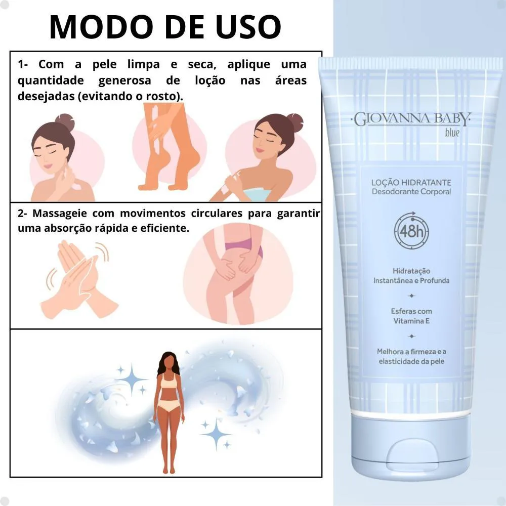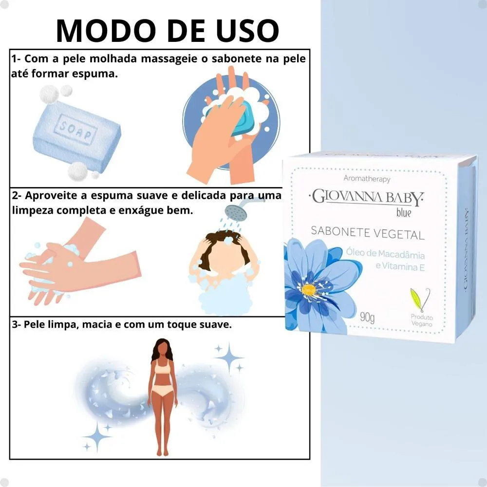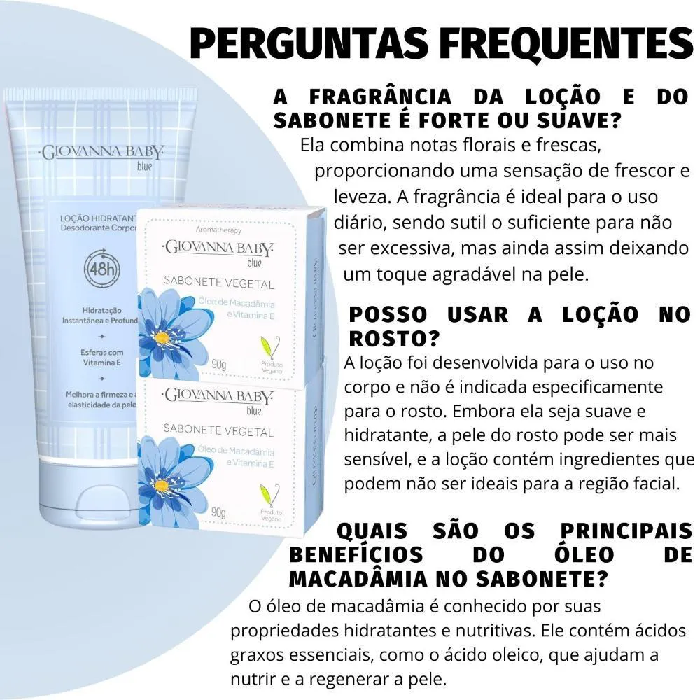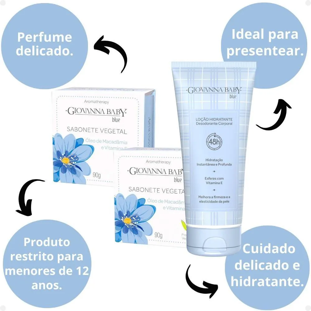 Kit Giovanna Baby Eterno Encanto Blue: 1 Loção Hidratante Corporal e 2 sabonetes Vegetais O Kit Giovanna Baby Eterno Encanto Blue é uma opção encantadora para o cuidado diário com a pele, composto por 1 Loção Hidratante Corporal 50ml e 2 Sabonetes Vegetais 90g. A loção oferece hidratação profunda e duradoura, deixando a pele macia e suavemente perfumada. Sua fórmula contém esferas com vitamina e, que auxiliam na melhoria da firmeza e elasticidade da pele. Além disso, funciona como desodorante corporal, garantindo 48 horas de eficiência. Os sabonetes são formulados com óleo de macadâmia e vitamina E, esses sabonetes limpam suavemente a pele, proporcionando uma sensação de frescor e bem-estar. São veganos e ideais para uma limpeza completa. Apresentado em uma embalagem presenteável, o Kit Giovanna Baby Eterno Encanto Blue é perfeito para quem busca qualidade e carinho nos cuidados diários com a pele. Restrito para menores de 12 anos. . Modo de Usar: Loção Hidratante Corporal Blue: Aplique na pele, massageando com movimentos suaves. Sabonete Vegetal Blue: Massagear sobre a pele molhada até formar espuma. Enxaguar em seguida. Precauções: Loção Hidratante Corporal Blue: Evite o rosto. Uso externo. Mantenha fora do alcance das crianças. Evite contato com os olhos. Caso ocorra, enxágue com água em abundância. Em caso de irritação, suspenda o uso e procure um médico. Produto de uso adulto. Sabonete Vegetal Blue: Uso externo. Evite contato com os olhos. Caso ocorra, enxágue abundantemente. Não usar na pele irritada ou lesionada. Em caso de irritação, suspender o uso e procurar um médico. Mantenha fora do alcance das crianças. Produto de uso adulto. . Perguntas Frequentes A Loção Hidratante Corporal é indicada para uso em pele com acne? Embora a loção tenha uma fórmula hidratante e suave, se você tiver pele com acne, é recomendável consultar um dermatologista antes de usar qualquer produto, especialmente se a acne for muito severa. Posso usar o Kit Giovanna Baby Blue durante a gravidez? Embora os produtos sejam suaves, durante a gravidez é sempre recomendado consultar um médico ou dermatologista antes de usar novos cosméticos, para garantir que os ingredientes são adequados para sua pele durante esse período. Os sabonetes vegetais são indicados para peles ressecadas? Sim, os sabonetes vegetais têm uma fórmula hidratante e são indicados para peles mais secas, ajudando a manter a hidratação natural da pele, sem causar ressecamento. O Kit Giovanna Baby Blue é cruelty-free? Sim, a marca Giovanna Baby segue práticas cruelty-free, o que significa que os produtos não são testados em animais. . Código de Registro Sanitário (ANVISA) Loção Hidratante: 25351.505724/2016-78 Sabonete Vegetal: 25351.903424/2021-10