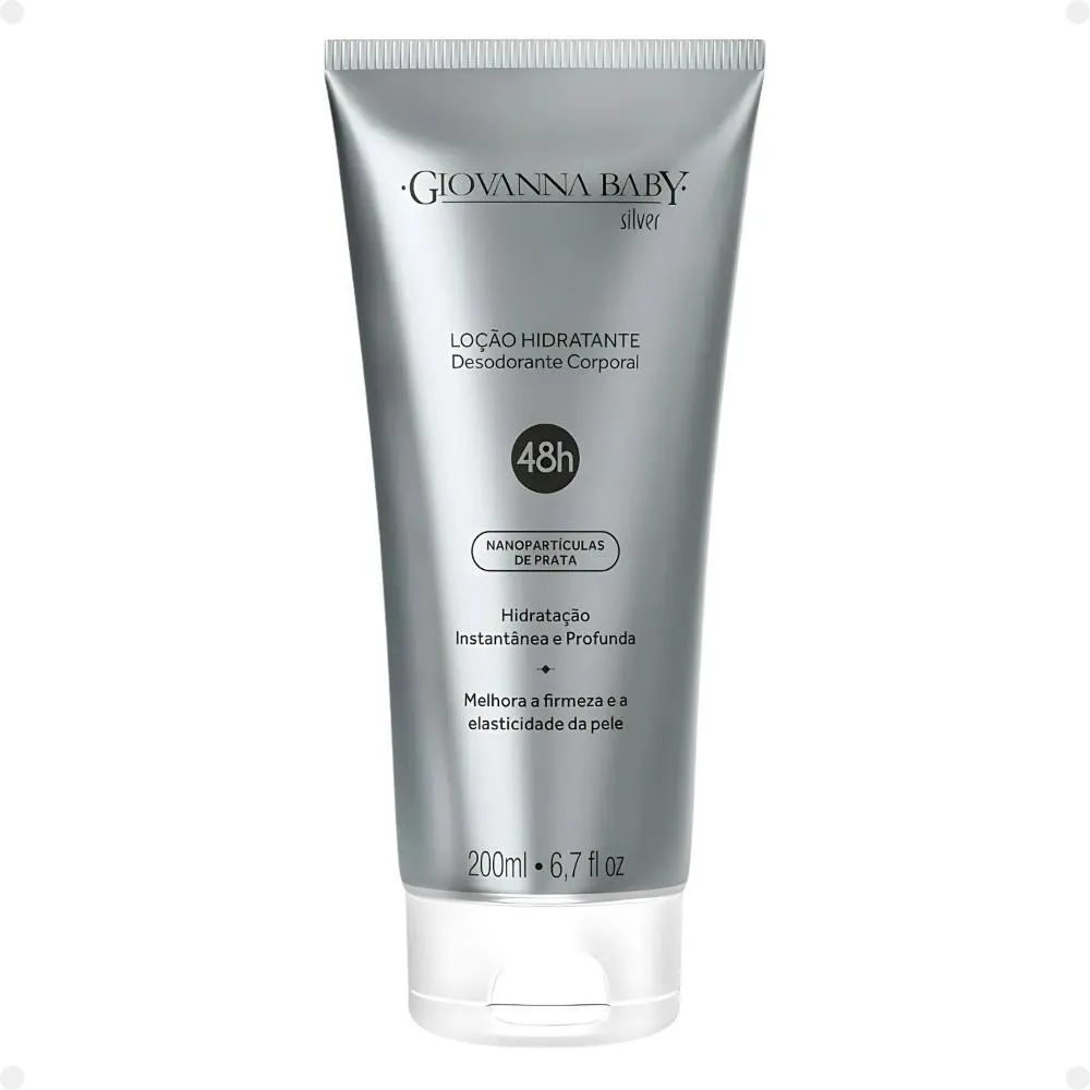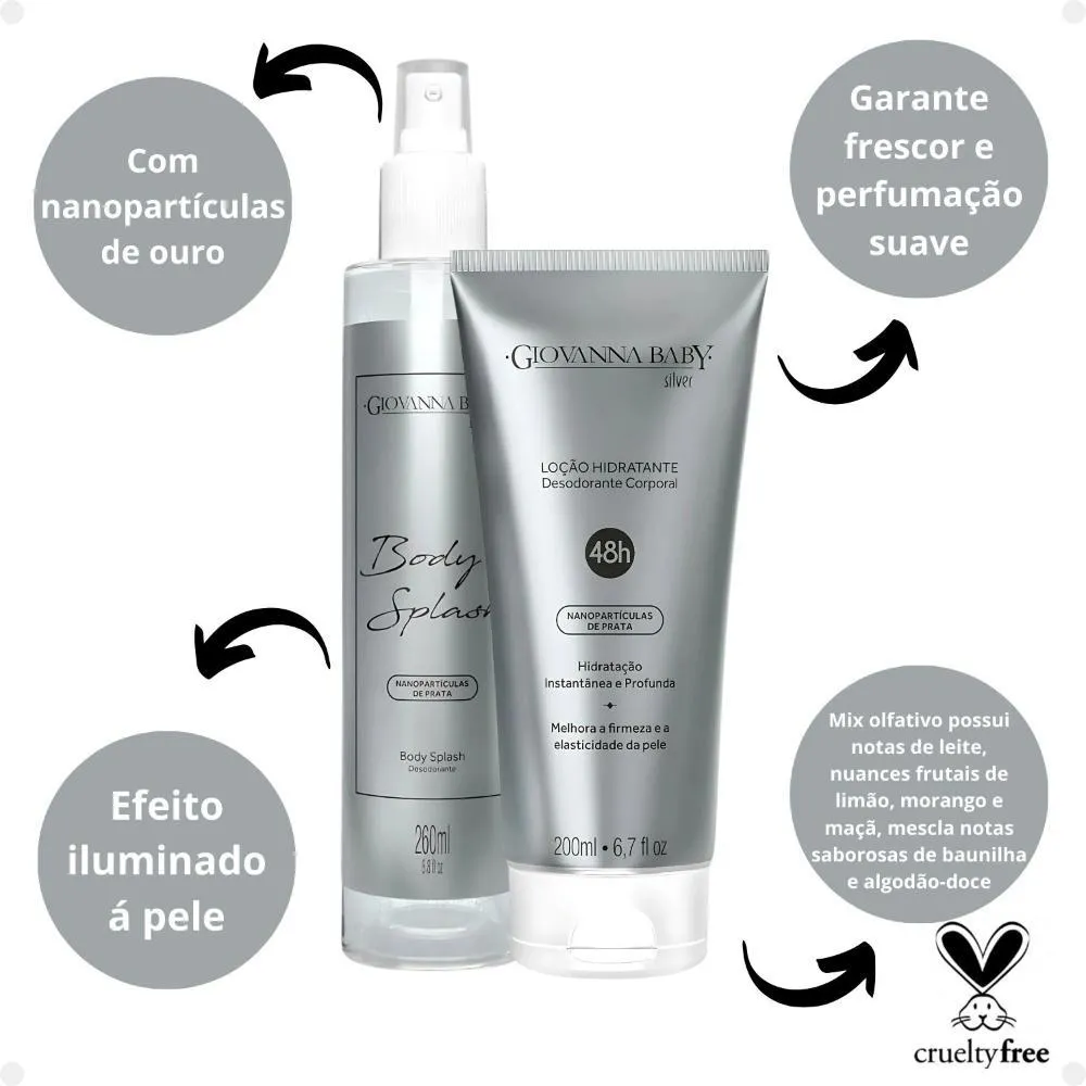 O kit Giovanna Baby Silver é composto por um Body Splash e uma Loção Hidratante com nanopartículas de prata, desenvolvidos para proporcionar hidratação, perfumação e um efeito iluminado suave à pele.