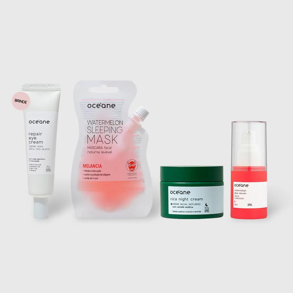 O Kit Glow Noturno Océane Combina Hidratação Profunda, Reparo Celular e Luminosidade com Fórmulas Ricas em Ativos Como Melancia, Cica e Niacinamida Transforme Sua Rotina de beleza com Este Kit Completo para Cuidados Faciais Noturnos. Enquanto Você Dorme, Sua Pele Se Renova, Acordando Visivelmente Mais Saudável, Radiante e Revitalizada.