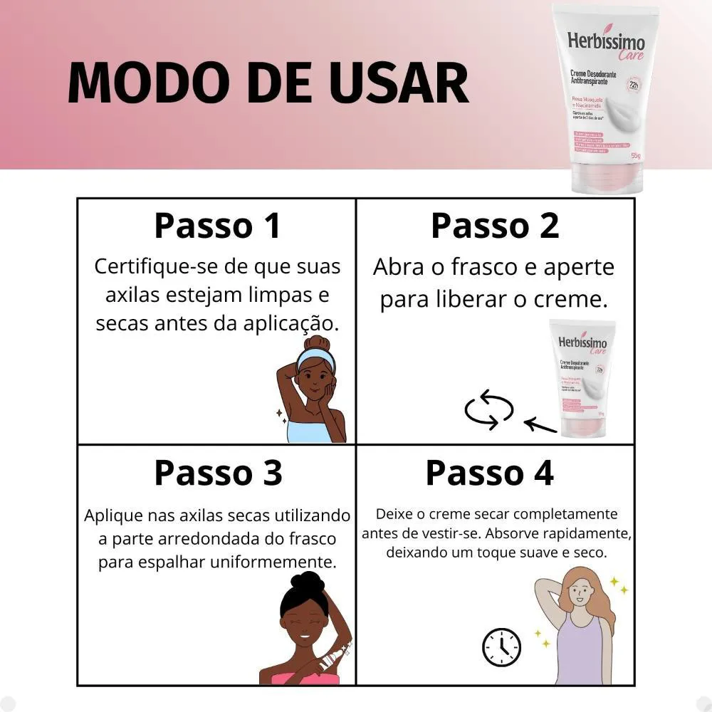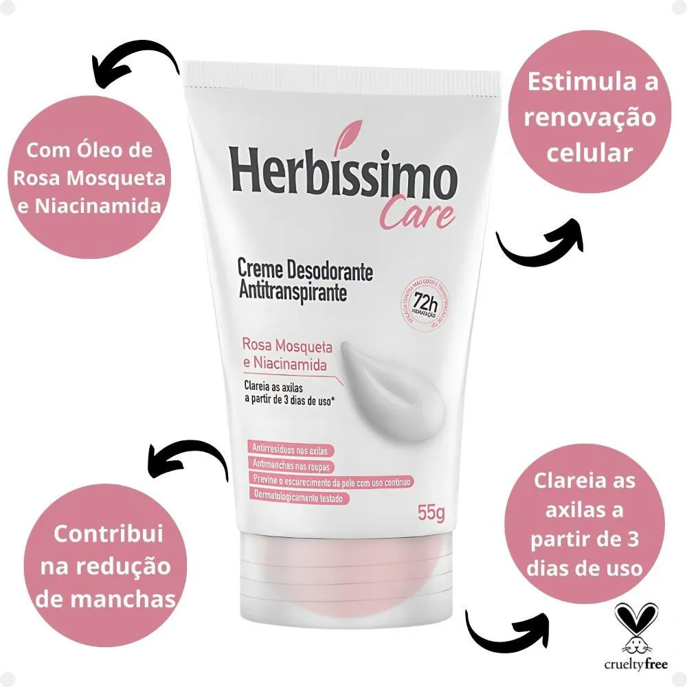 Contém: - 03 Cremes desodorantes Antitranspirante Herbissimo Care Rosa Mosqueta e Niacinamida 55g. . Creme Desodorante Rosa Mosqueta e Niacinamida Óleo de Rosa Mosqueta: ação antioxidante, que contribui na redução de manchas e estimula a renovação celular. Niacinamida: vitamina B3 otimizada para uso em cosméticos, que mantém a pele resiliente a danos externo e uniformiza o tom da pele. • Clareia as axilas a partir de 3 dias de uso. • Antirresíduos nas axilas. • Antimanchas nas roupas. • Previne o escurecimento da pele com o uso contínuo. • Dermatologicamente testado. • Não testado em animais. . Modo de Uso Abra a tampa, aperte a bisnaga até sair a quantidade desejada pelo furo da embalagem e aplique diretamente nas axilas. Espere secar bem antes de se vestir, para não manchar a roupa. . Composição Aqua, Aluminum Chlorohydrate, Cetyl Alcohol, Glycerin, Cetearyl Alcohol, Glyceryl Stearate, Ceteareth-20, Helianthus Annuus Seed Oil, Ethylhexyl Stearate, Niacinamide, Parfum, Triethyl Citrate, Gossypium Hirsutum Seed Oil, Propanediol, Linum Usitatissimum Seed Oil, 1,2-Hexanediol, Caprylyl Glycol, Disodium EDTA, Pentaerythrityl Tetra-Di-T-Butyl Hydroxyhydrocinnamate, Rosa Moschata Seed Oil, Cocos Nucifera Oil, Stearyl Alcohol, Myristyl Alcohol, Tropolone, Methylpropanediol, Polysorbate 80, Caesalpinia Spinosa Gum, Gluconolactone, 4-Terpineol, Gardenia Taitensis Flower Extract, Potassium Sorbate, Sodium Benzoate, Tocopherol , Calcium Gluconate, Salix Alba Bark Extract, Citronellol, Linalool, Alpha-Isomethyl Ionone. . Código de Registro Sanitário (ANVISA) 25351.380262/2024-73