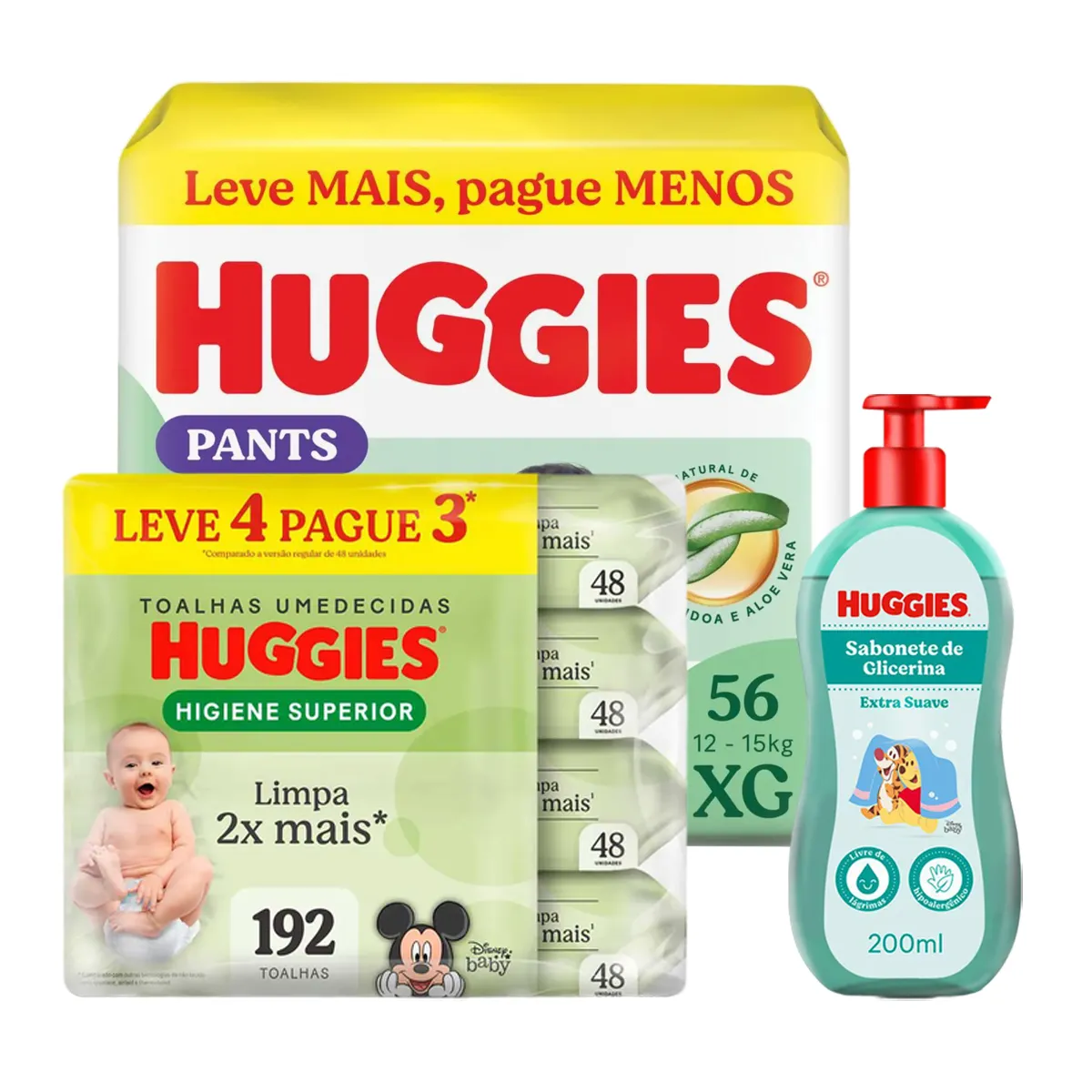 Kit Huggies Fralda Calça Pants Natural Care XG 56 unidades + Lenço Umedecido Higiene Superior 48 unidades 4 pacotes + Sabonete Líquido de Glicerina Extra Suave 200ml