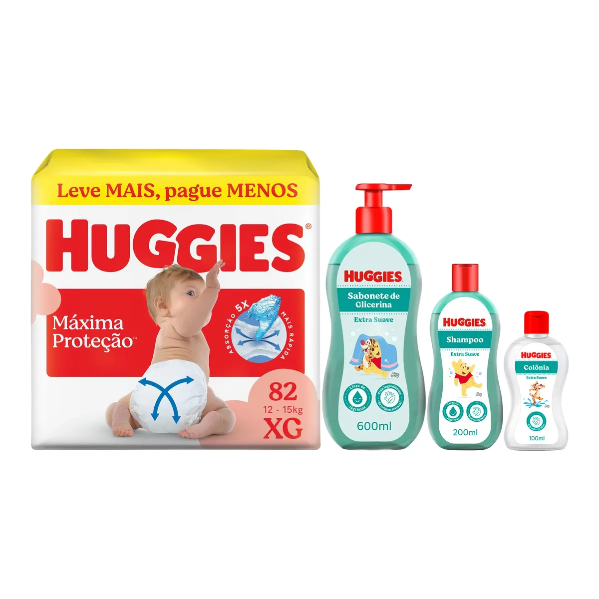 Kit Huggies Fralda Máxima Proteção XG 82 unidades + Sabonete Líquido de Glicerina 600ml + Shampoo 200ml + Colônia Extra Suave 100ml