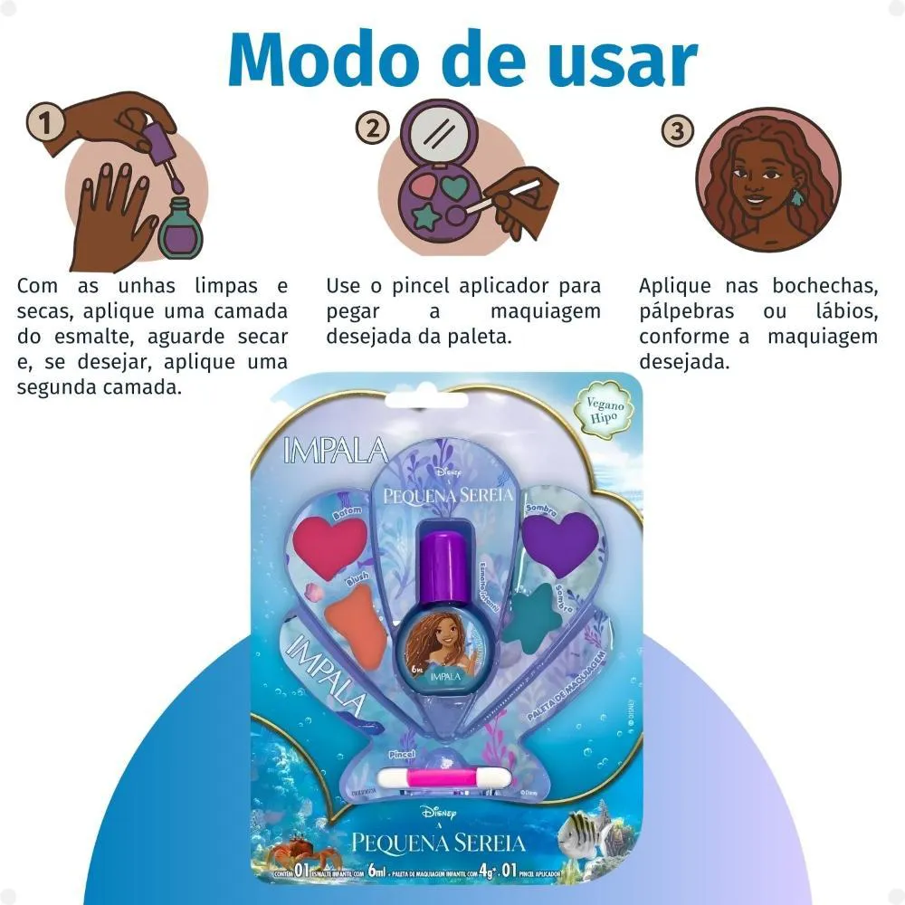 Kit Impala A Pequena Sereia: 01 Esmalte, 1 Paleta de maquiagem e 1 Pincel aplicador