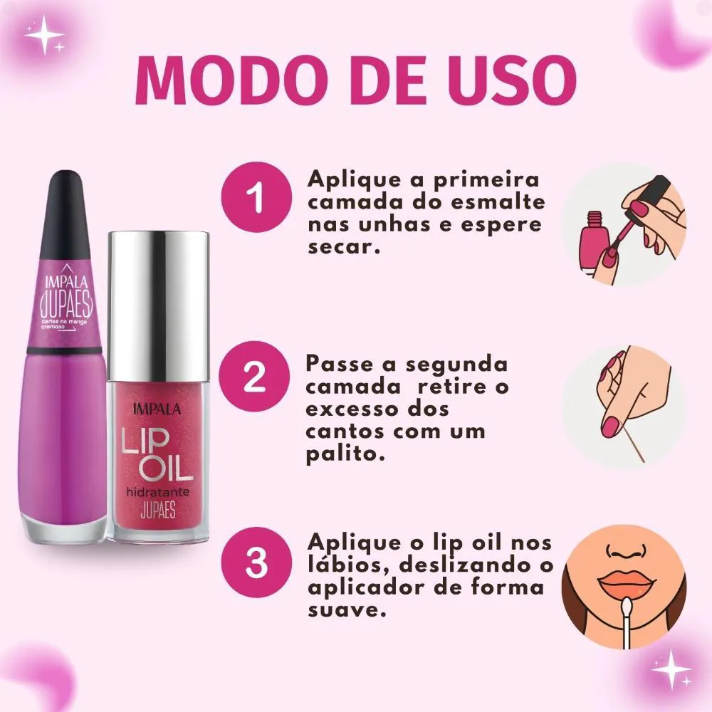 Kit Impala Ju Paes Virando O Jogo Cartas Na Manga: 1 Esmalte Cremoso e 1 Lip Oil Hidratante
