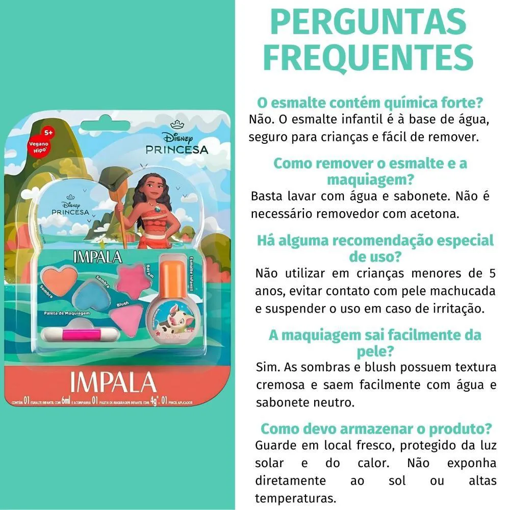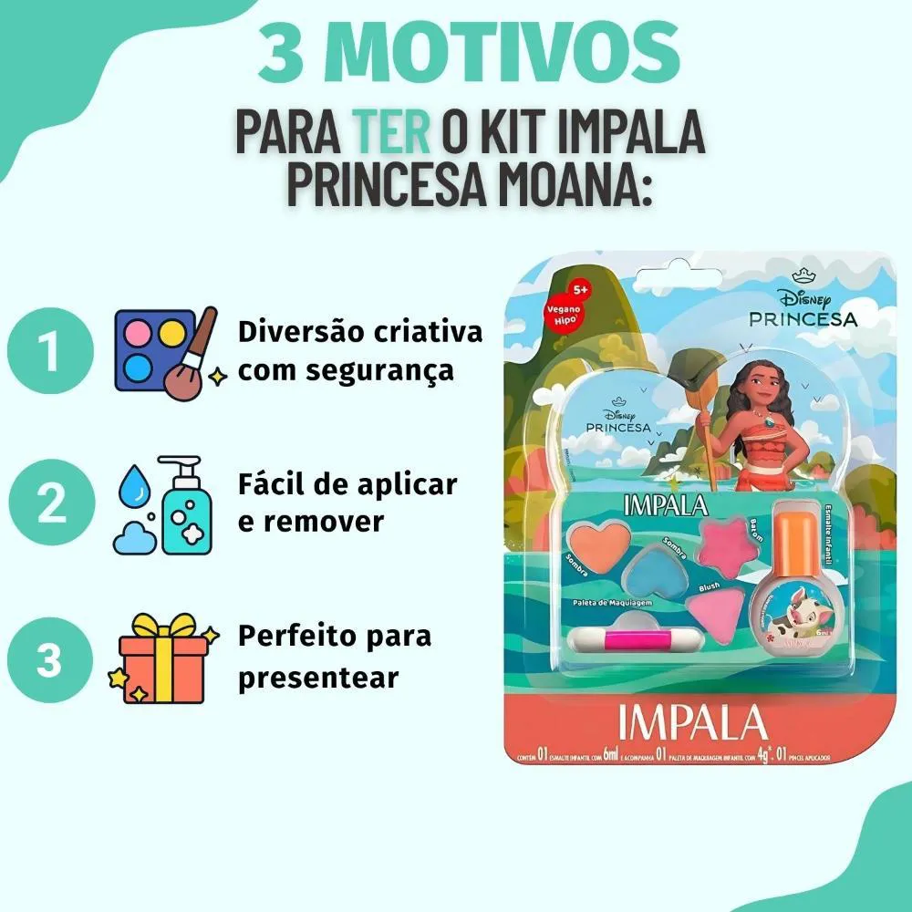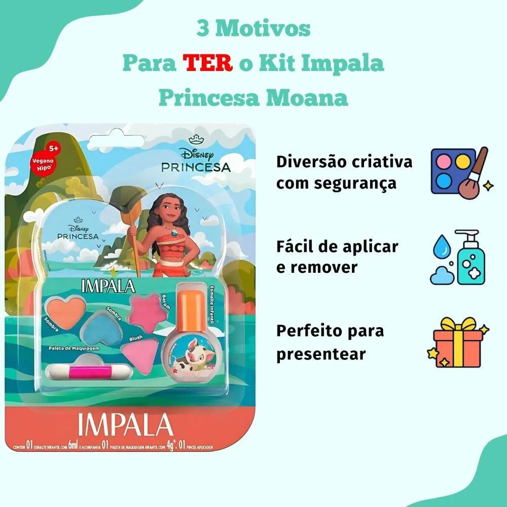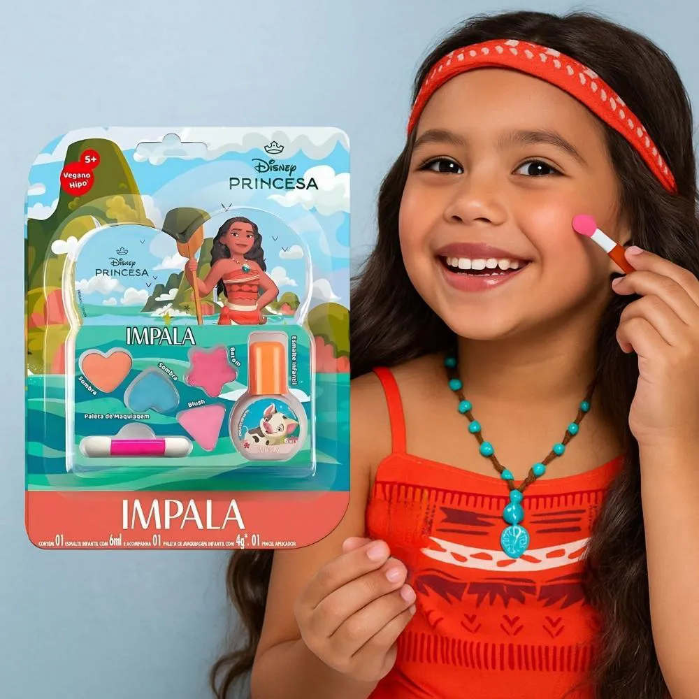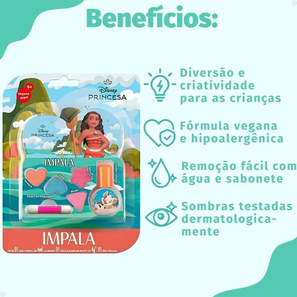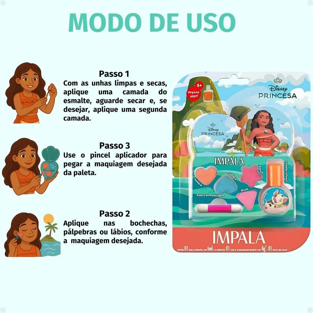 Kit Impala Princesa Moana: Esmalte, Paleta de maquiagem e Pincel Aplicador