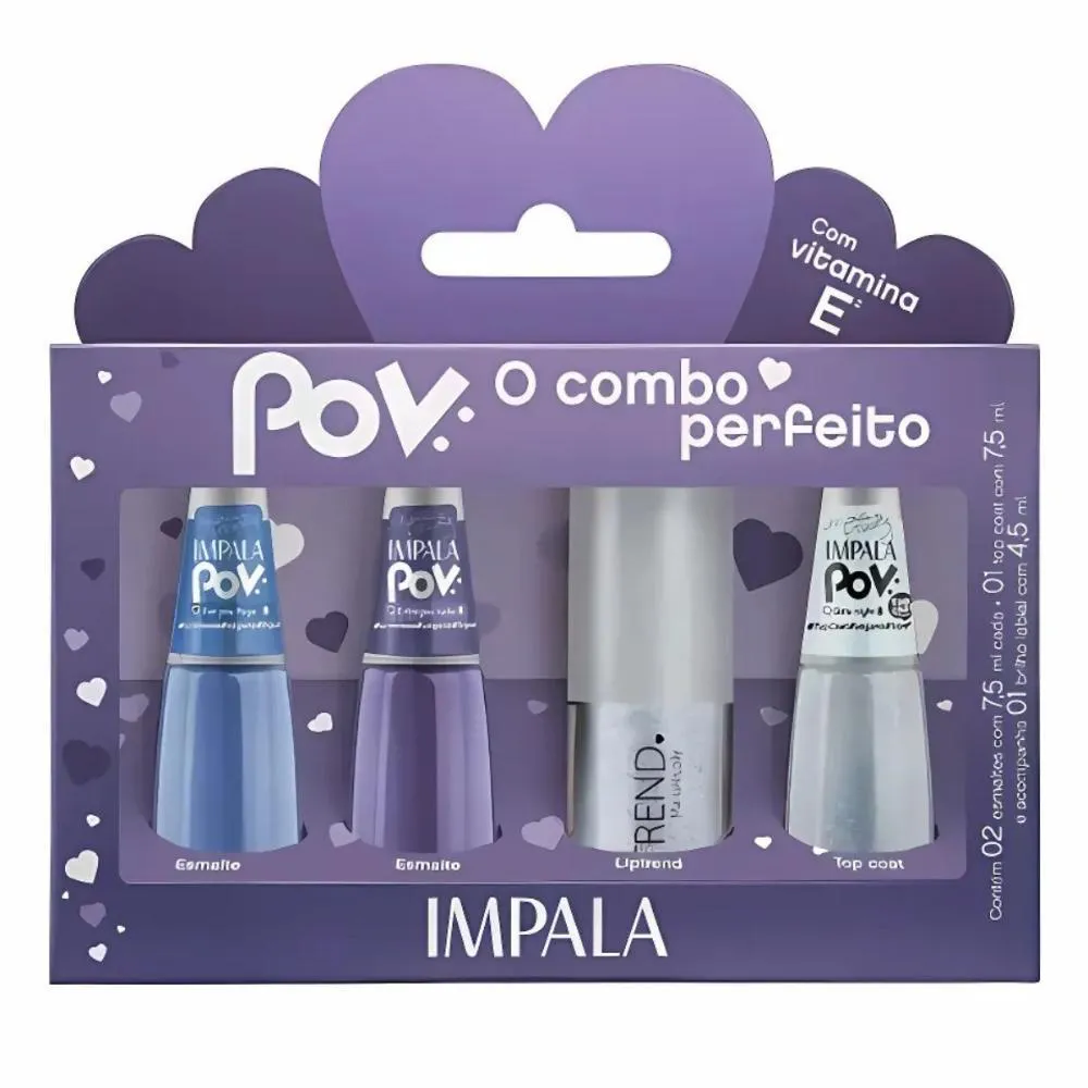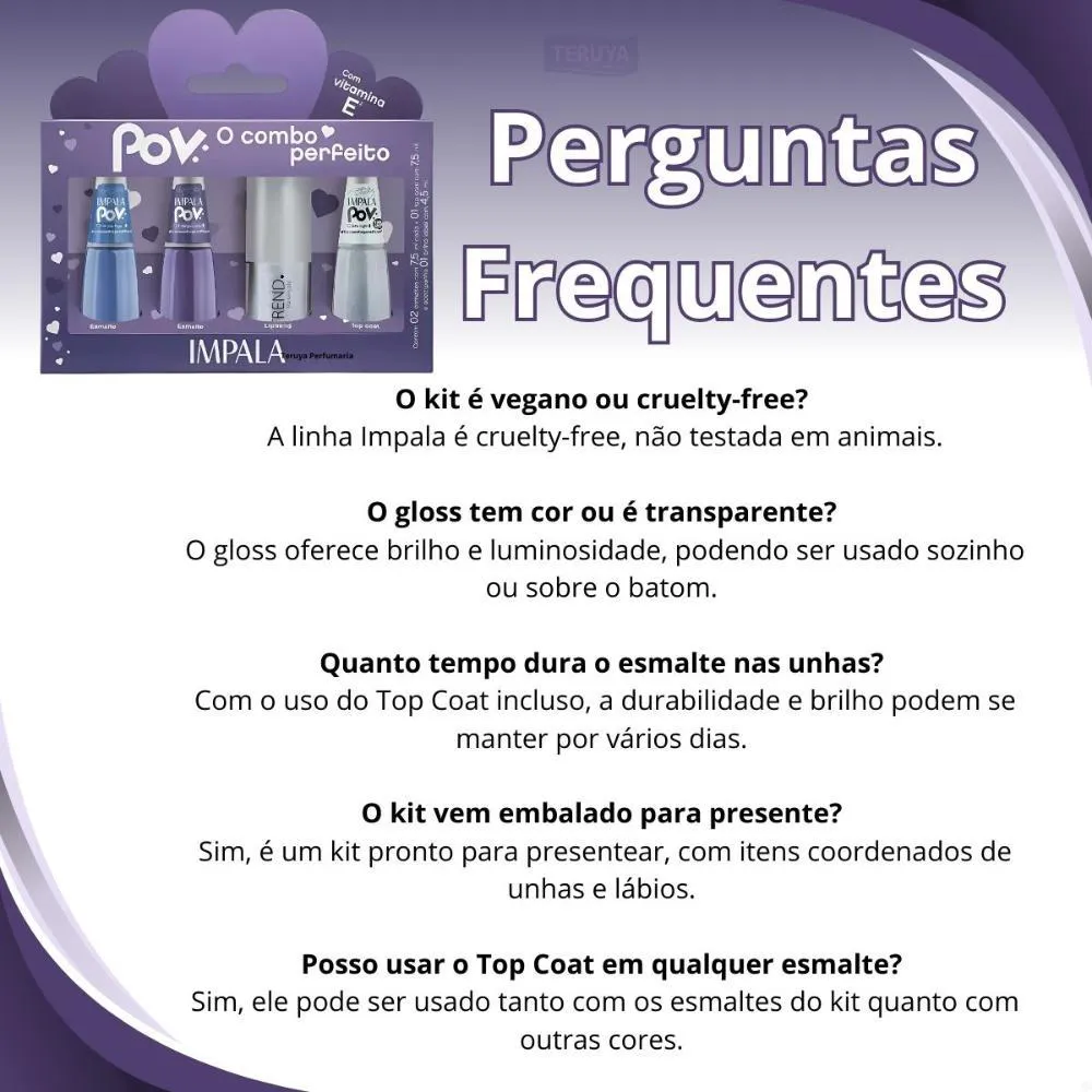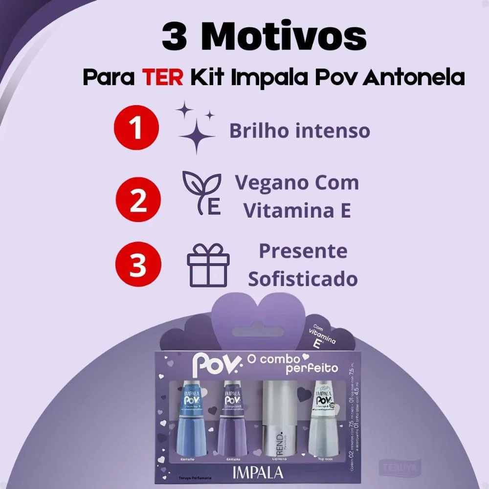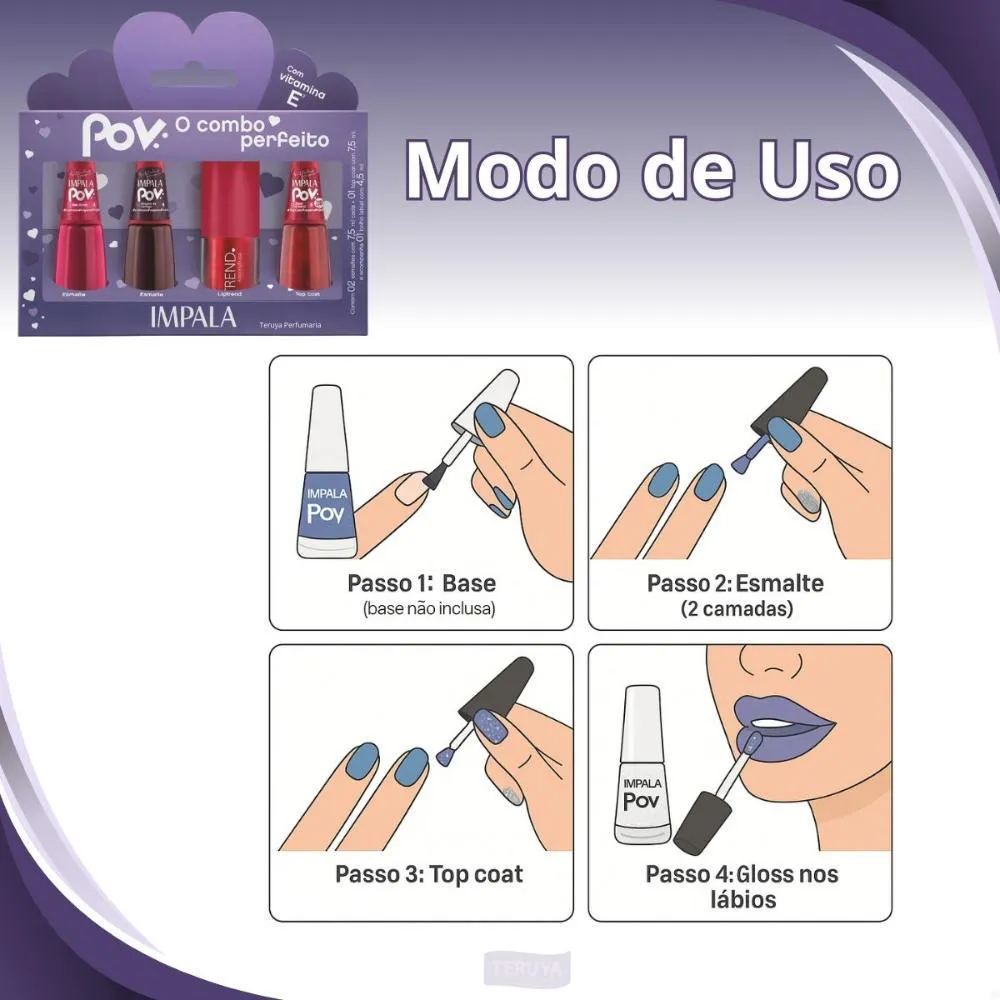 Kit Impala Pov 2.3 Maria Nicolly: 2 esmaltes, 1 Top Coat e 1 Gloss Labial