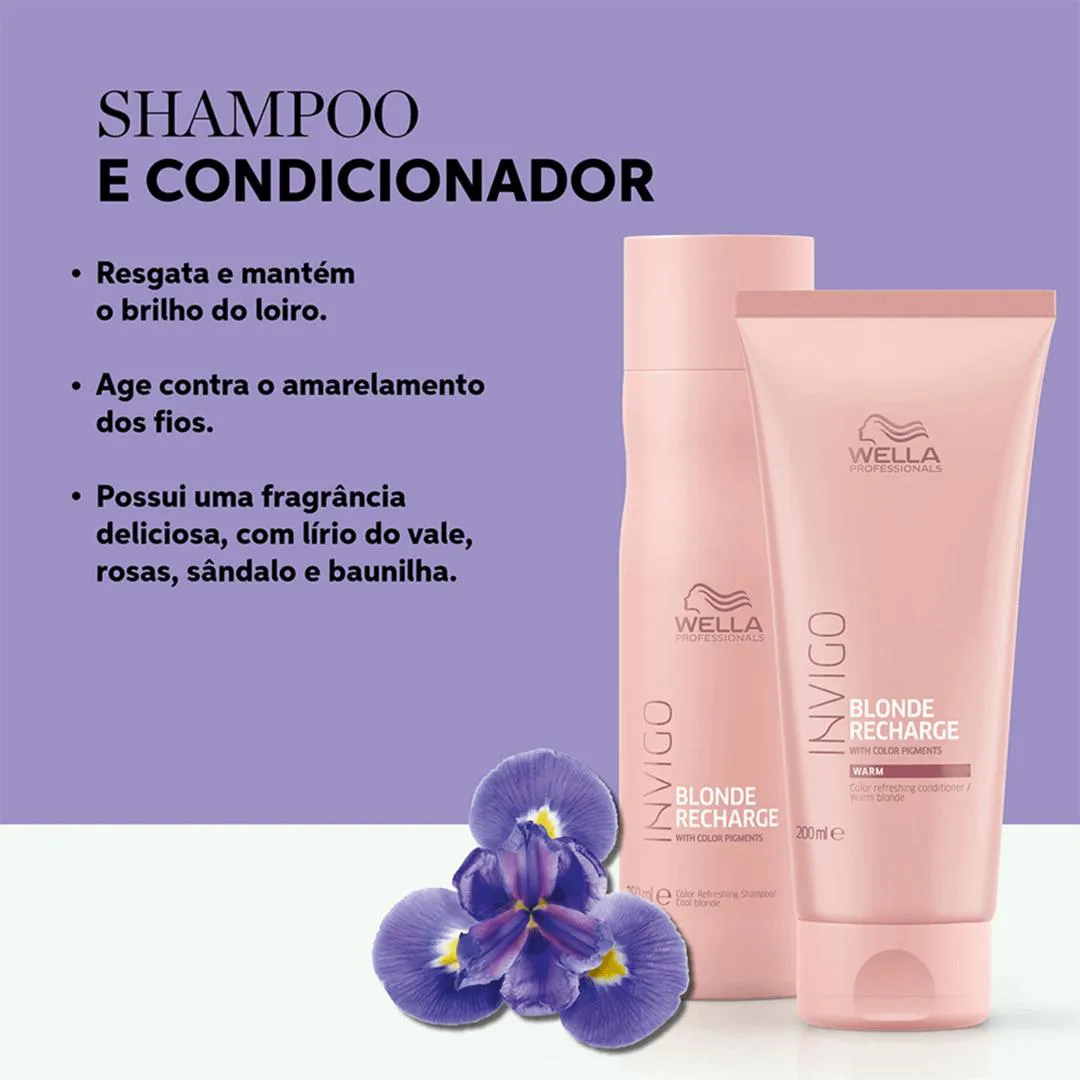 O Kit Wella Professionals Invigo Blonde Recharge Duo é um conjunto de tratamento capilar específico para cabelos loiros descoloridos ou naturais, composto por shampoo e condicionador com pigmentos violeta.