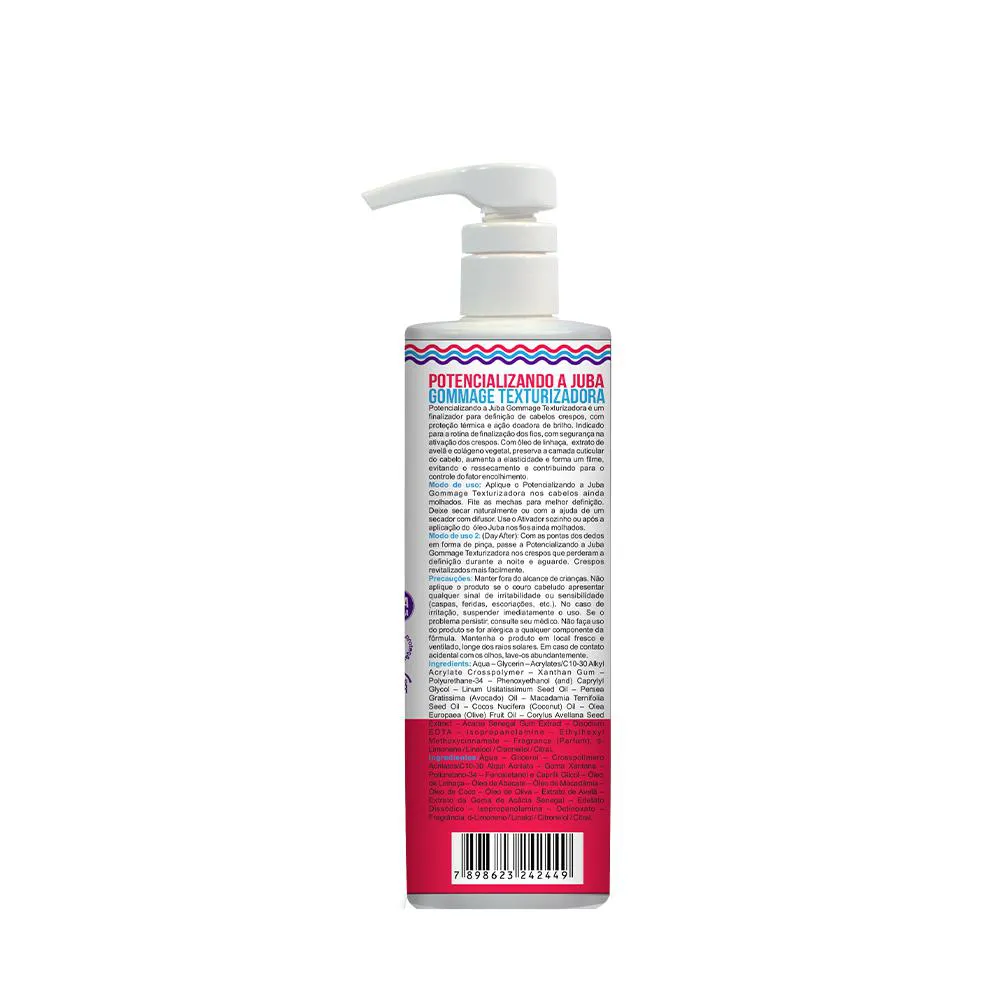 Potencializando a Juba Gommage Texturizadora Condicionante 480g: Um finalizador projetado para a definição de cabelos crespos, com proteção térmica e brilho. Contém óleo de linhaça, extrato de avelã e colágeno vegetal, mantendo a cutícula capilar preservada, aumentando a elasticidade e controlando o encolhimento dos fios. Como usar? Aplique nos cabelos molhados e defina os cachos com as mãos, formando fitas para melhor definição. Deixe secar naturalmente ou utilize um secador com difusor. Pode ser usado sozinho ou após aplicar o óleo Juba nos cabelos úmidos. Não é necessário usar outros finalizadores.