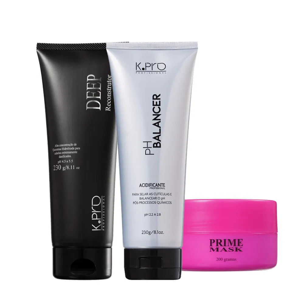 Kit K.Pro Profissional Cronograma Deep Recostrutor pH Balancer e Prime Mask (3 produtos) Este Kit Contém K.Pro Profissional pH Balancer - Acidificante Capilar 230g: acidificante para todos tipos de cabelo. Sela as cutículas e potencializa hidratações e reconstruções. Ele restabelece o equilíbrio dos fios e sela as escamas. Assim, mantém os nutrientes e outros ativos dentro das fibras capilares, para um efeito mais potente.Você também pode usa-lo como um pós-química, para reequilibrar os fios depois de processos químicos. K.Pro Profissional Hidra Prime Mask - máscara de Hidratação 200g: para cabelos ressecados e danificados. Trata os fios profundamente, proporcionando sedosidade, brilho e reconstrução. Previne a oxidação e protege dos danos solares, mantendo a cor natural ou artificial sempre bonita. K.Pro Profissional Deep Reconstrutor - Tratamento Capilar 230g: reconstrutor para cabelos danificados. Ele penetra profundamente nos fios e preenche a porosidade. Incrível tratamento para reconstrução de cabelos danificados por químicas ou agentes ambientais. Com fórmula suave e eficaz, fortalece e suaviza a cutícula para toque suave e muito brilho! Conselho de Aplicação Acididificante para hidratação: antes da hidratação, mas após lavar os cabelos, tire o excesso da umidade e aplique o acidificante K.Pro mecha a mecha. Massageie e penteie. Deixe agir por 3 minutos e enxágue. Prossiga com o tratamento. Máscara Prime: após lavar os cabelos, aplique mecha por mecha. Massageie suavemente os fios, penteie com um pente de dentes largos, deixe agir de 3 a 5 minutos e enxague abundantemente. Deep: Após lavar os cabelos, retire o excesso de água com uma toalha suavemente. Aplique o produto nos fios, penteie e deixe agir por 3 minutos. Enxague e aplique o condicionador em seguida.