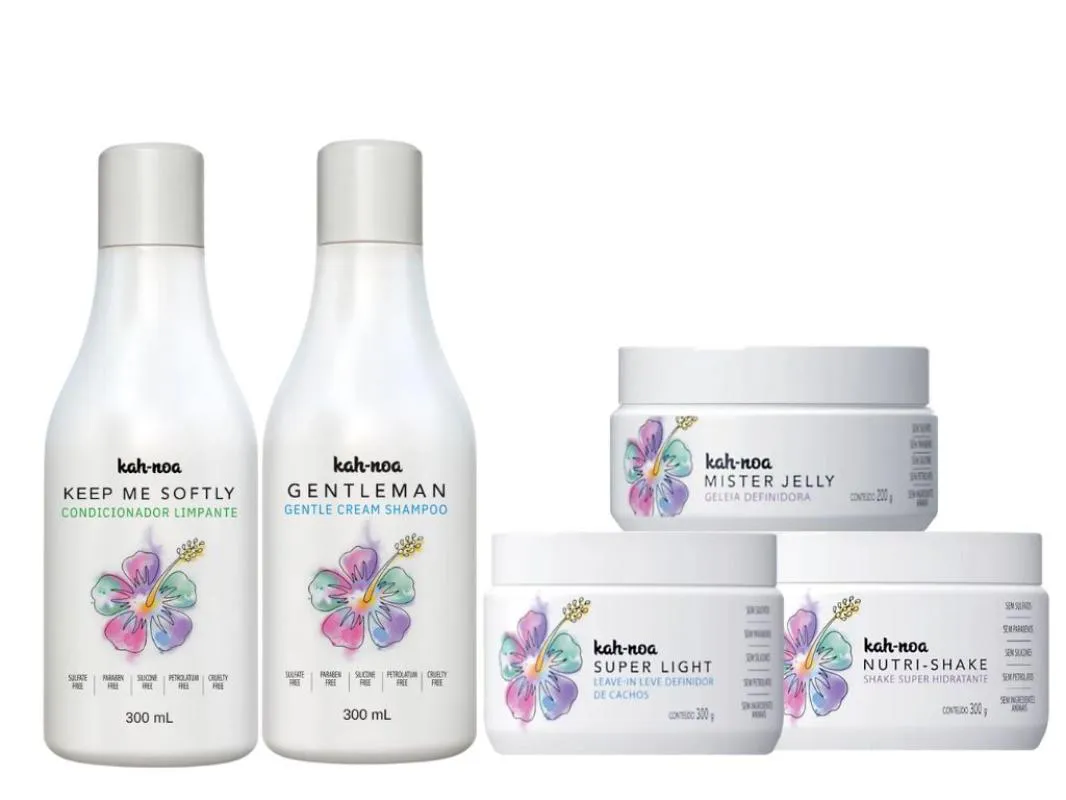 Este é o Kit Clássico Kah-noa Para Cabelos Cacheados, uma linha completa para os cuidados diários dos seus cachos. Essencial no cronograma capilar de qualquer cabelo cacheado. O Kit contém: - shampoo Gentleman 300g (Shampoo sem sulfato, que limpa sem agredir os fios) - condicionador Kiss me Softly 300g (Blend super nutritivo e condicionante) - máscara Nutrishake 300g (Máscara hidratante e vitaminada, ideal para o dia a dia) - Leave-in Super Light 300g (Queridinho das blogueiras, caimento leve e natural dos cachos) - Geleia Mister Jelly 200g (Para segurar seus cachos por longas horas, look totalmente natural) Todos os produtos Kah-noa são livres de sulfatos, parabenos, silicones, petrolatos, corantes, parafinas e ingredientes animais. Liberado para rotinas No Poo e Low Poo.