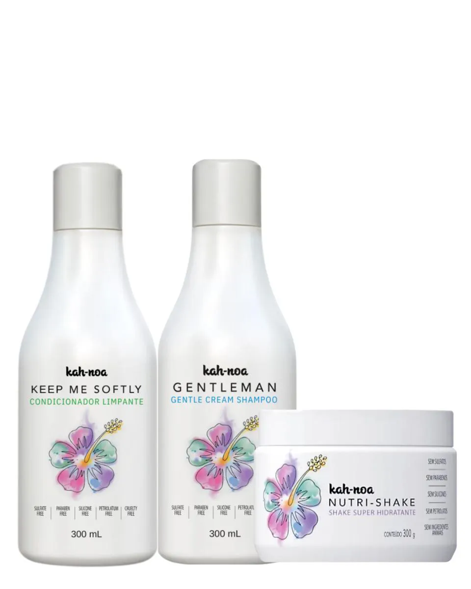 shampoo Creme, condicionador e Nutri-Shake Kah-Noa 01 Shampoo Gentleman 300g (Shampoo sem sulfato, que limpa sem agredir os fios) 01 Condicionador Keep me Softly 300g (Blend super nutritivo e condicionante) 01 máscara Nutrishake 300g (Máscara hidratante e vitaminada, ideal para o dia a dia) Para cabelos cacheados, crespos, ondulados e em transição!