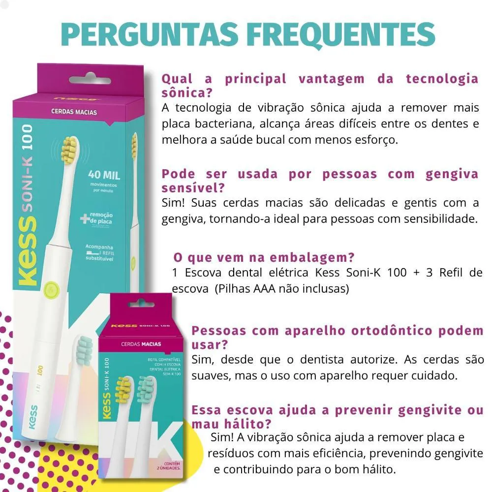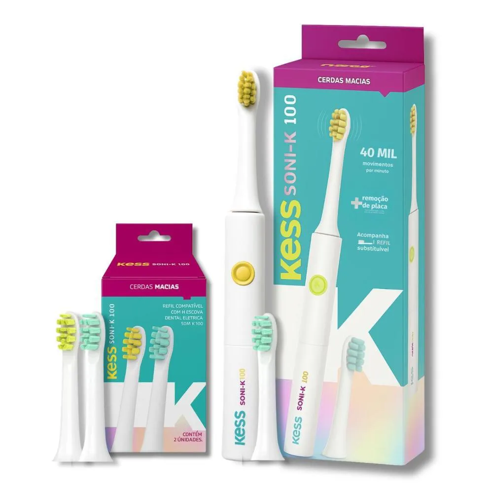 1 Escova Dental Elétrica Kess Belliz Soni-K 1001 Refil de Escova Dental (já incluso com a escova)2 Refis Extras de Escova DentalEste kit completo é ideal para quem busca praticidade, eficiência e tecnologia na hora de escovar os dentes. A Escova Elétrica Kess Soni-K100 foi desenvolvida com tecnologia sônica, realizando até 30.000 vibrações por minuto para uma limpeza mais profunda do que uma escova manual. O refil original (com 2 unidades) garante a manutenção da performance, com cerdas macias que protegem as gengivas e removem até 7x mais placa bacteriana. Ideal para adultos que desejam mais eficácia na escovação, com praticidade e segurança no dia a dia.