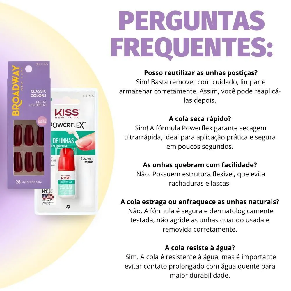 O Kit Contém: - 1 Unhas Postiças Broadway Kiss Ny Classic Colors Com 28 Unhas - 1 Cola De Unhas Kiss New York Secagem Rápida 3g