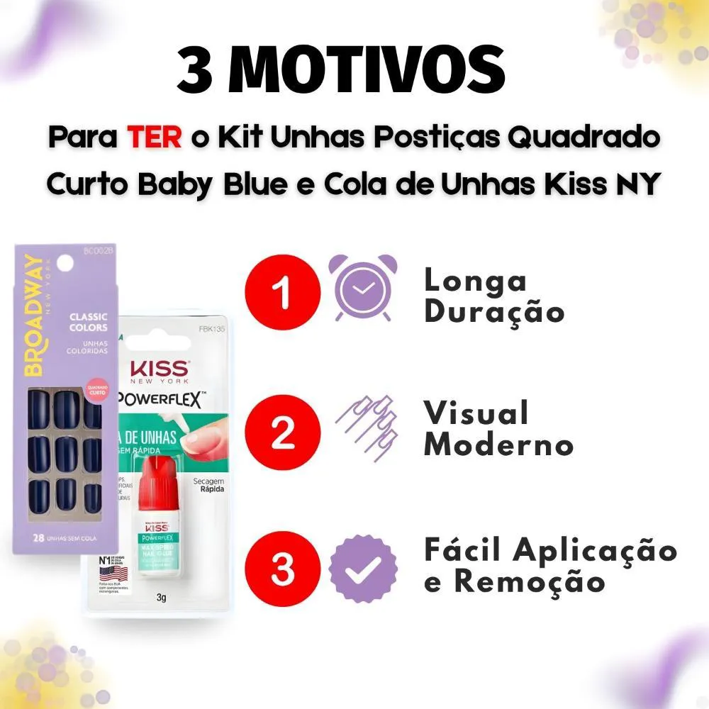 Kit Kiss New York: Unhas Postiças Quadrado Curto Baby Blue e Cola de Unhas 3G