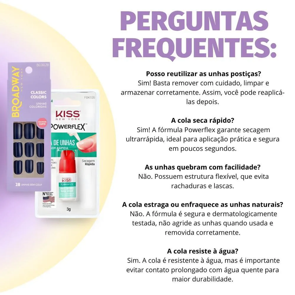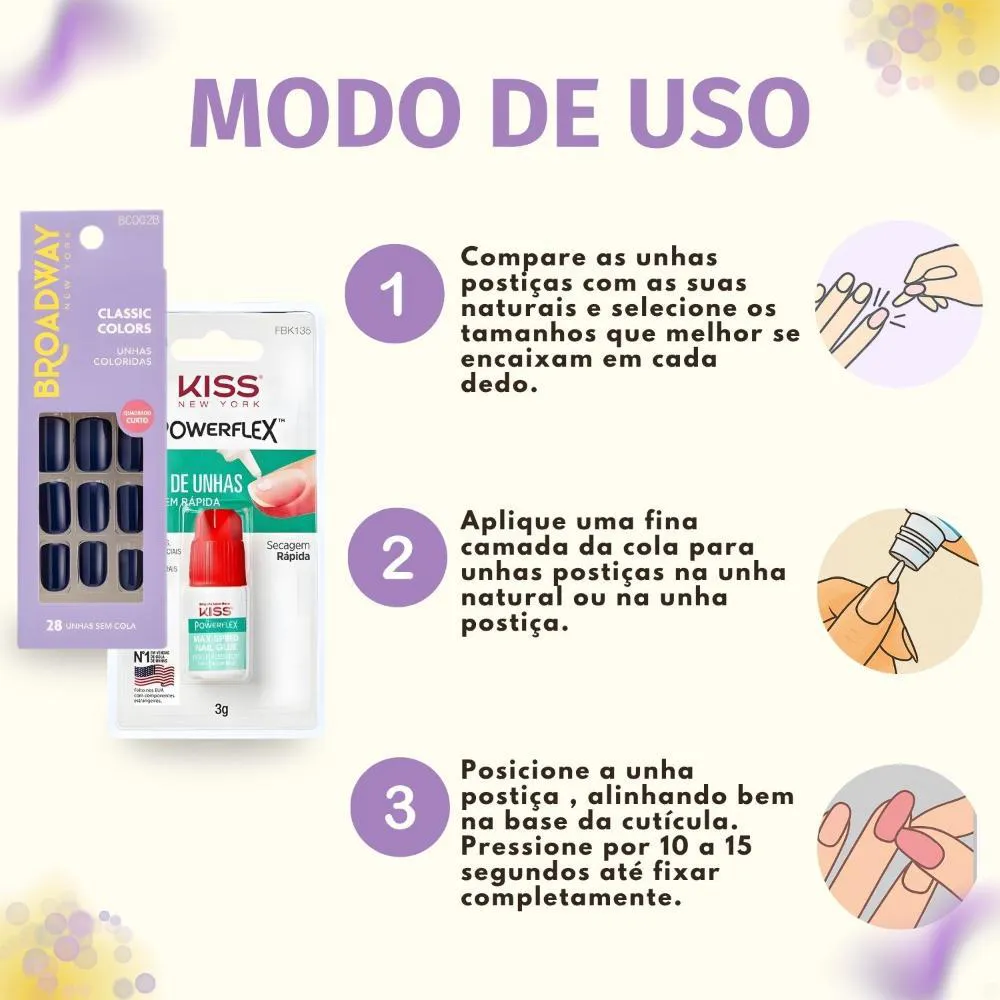 O Kit Contém: - 1 Unhas Postiças Broadway Kiss Ny Classic Colors Com 28 Unhas - 1 Cola De Unhas Kiss New York Secagem Rápida 3g