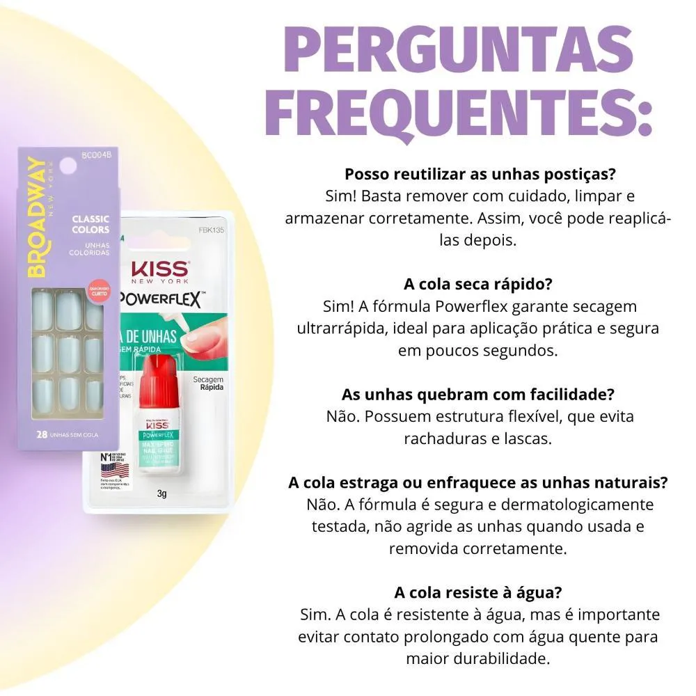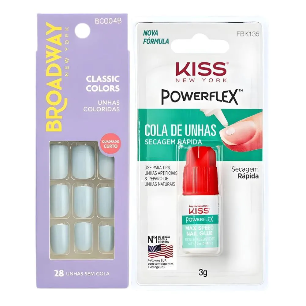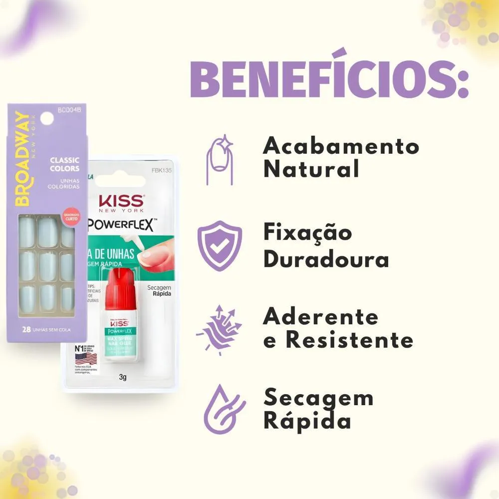 O Kit Contém: - 1 Unhas Postiças Broadway Kiss Ny Classic Colors Com 28 Unhas - 1 Cola De Unhas Kiss New York Secagem Rápida 3g