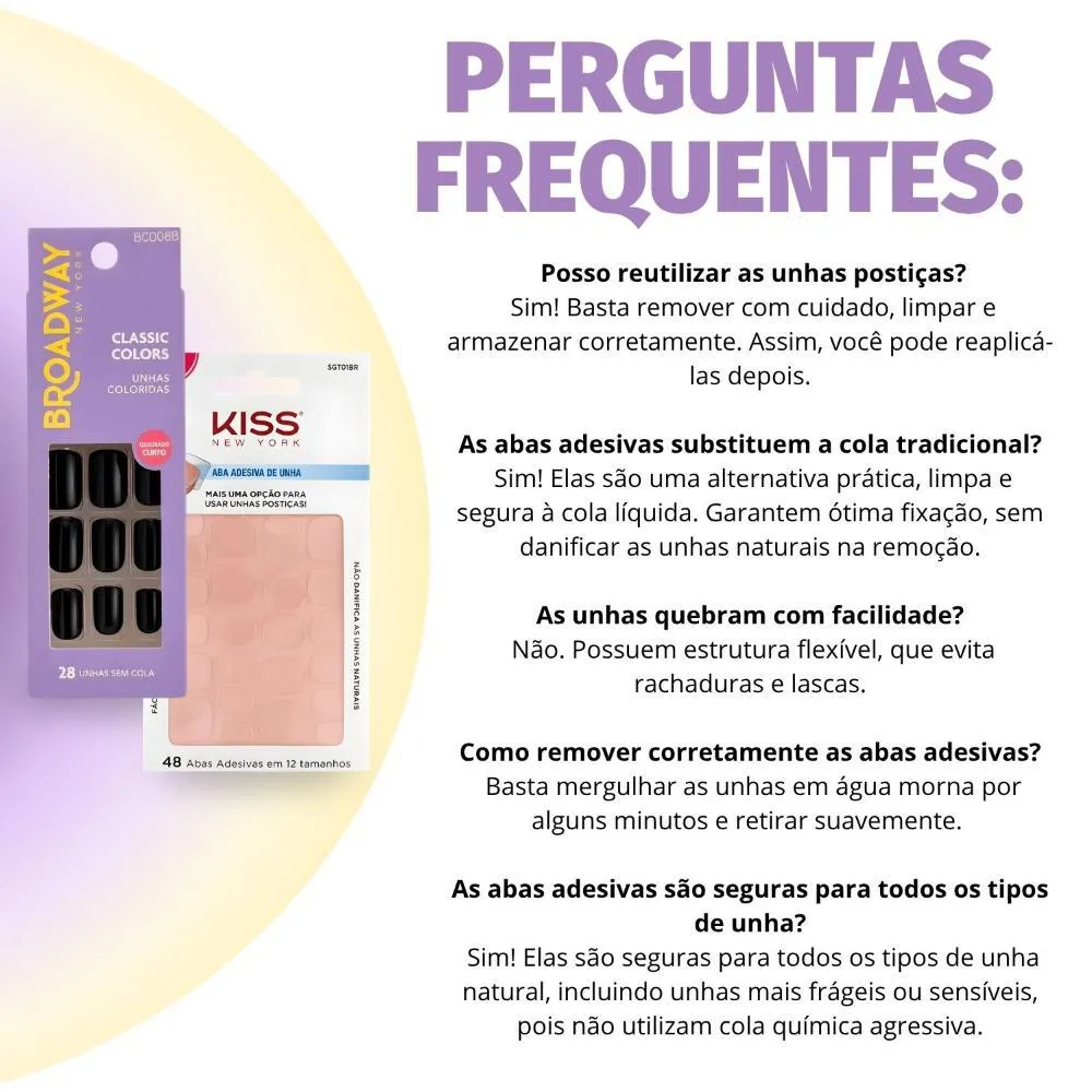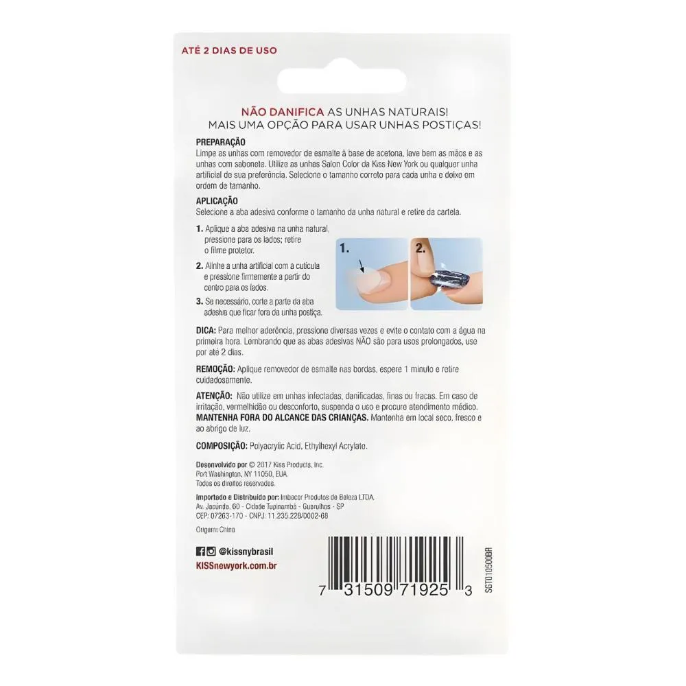 O Kit Contém: - 1 Unhas Postiças Broadway Kiss Ny Classic Colors Com 28 Unhas - 1 Aba Adesiva De Unha Com 48 Abas Em 12 Tamanhos