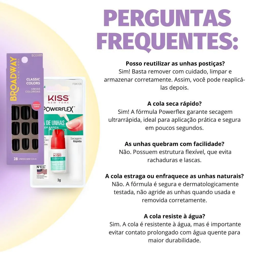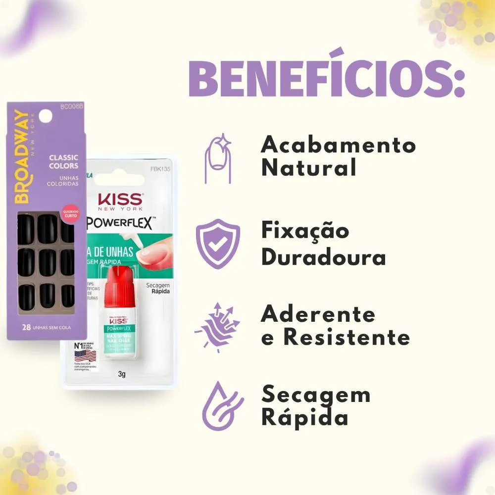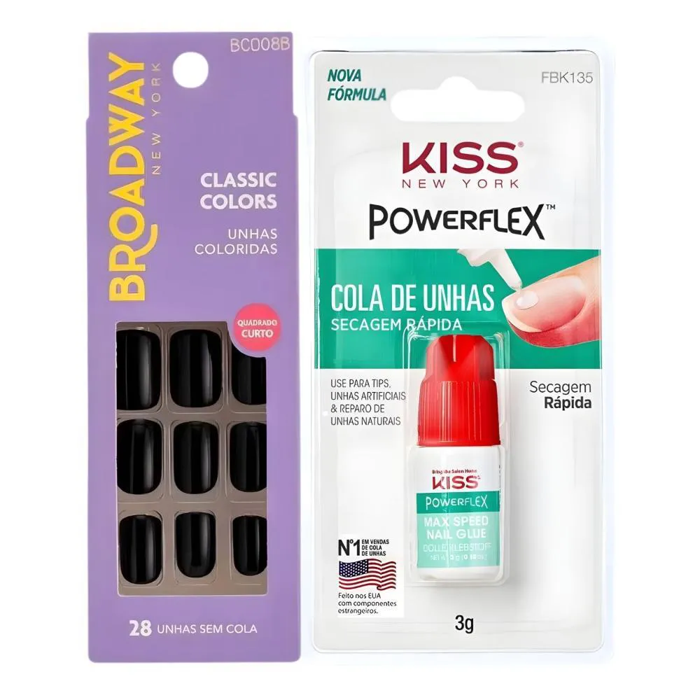 O Kit Contém: - 1 Unhas Postiças Broadway Kiss Ny Classic Colors Com 28 Unhas - 1 Cola De Unhas Kiss New York Secagem Rápida 3g