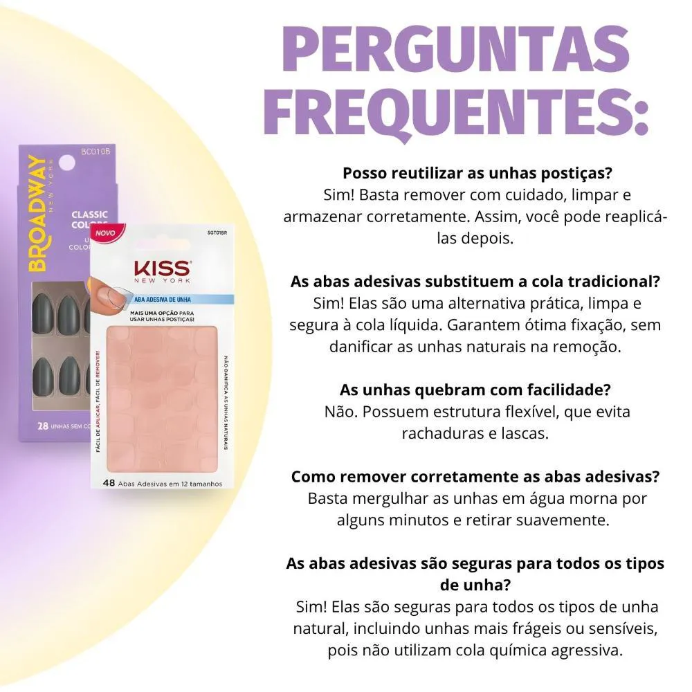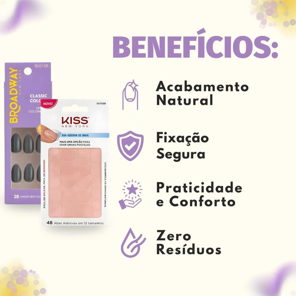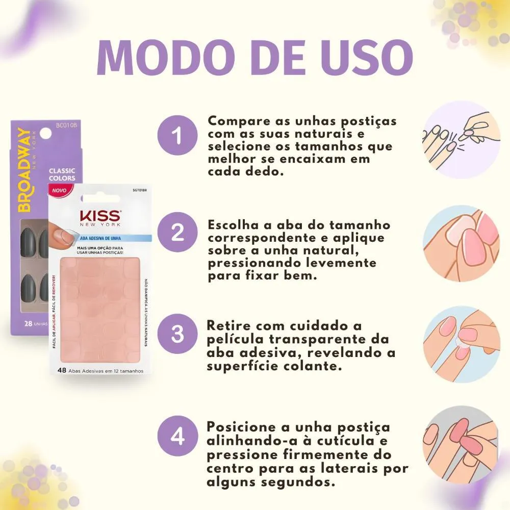 O Kit Contém: - 1 Unhas Postiças Broadway Kiss Ny Classic Colors Com 28 Unhas - 1 Aba Adesiva De Unha Com 48 Abas Em 12 Tamanhos