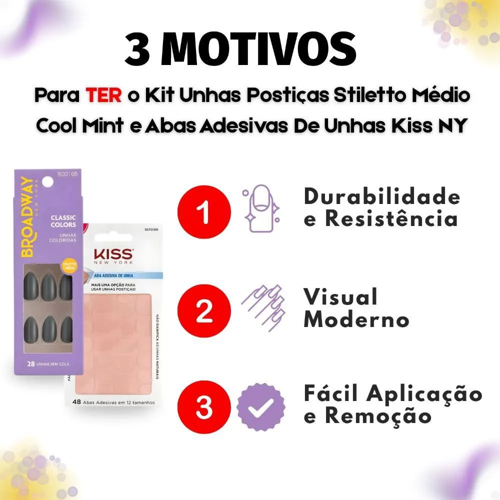 Kit Kiss New York: Unhas Postiças Stiletto Médio Cool Mint e Abas Adesivas de Unnhas