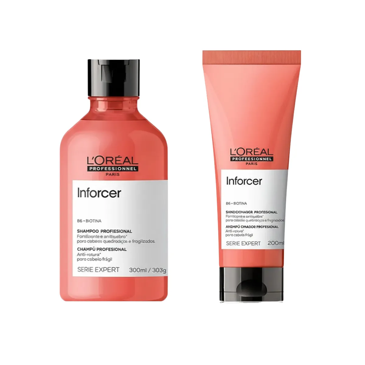 O Kit Inforcer L'Oréal Professionnel Shampoo Antiquebra + Condicionador foi especialmente desenvolvido para tratar cabelos fracos, frágeis e danificados. Sua fórmula enriquecida com biotina e vitamina B6 fortalece a fibra capilar desde a raiz, reduzindo a quebra e promovendo o crescimento saudável. Além de sua ação antiquebra, o shampoo proporciona limpeza eficaz e suavidade, deixando os fios mais macios, resistentes e brilhantes. O condicionador hidrata, desembaraça e suaviza a fibra capilar, deixando os cabelos mais resistentes e saudáveis com o uso contínuo.