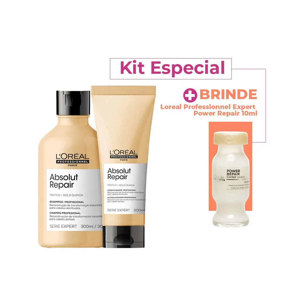 Kit L'Oréal Professionnel Serie Expert Absolut Repair Gold Quinoa Protein Duo (2 Produtos) + Este Kit Contém L'Oréal Professionnel Serie Expert Absolut Repair Gold Quinoa Protein shampoo 300ml: para cabelos danificados, reestrutura a fibra capilar, confere brilho e leveza durante a limpeza diária dos fios. L'Oréal Professionnel Serie Expert Absolut Repair Gold Quinoa Protein condicionador 200ml: Condicionador para cabelos danificados. L'Oréal Professionnel Serie Expert Absolut Repair Gold Quinoa + Protein Instant Resurfacing Conditioner desembaraça e reestrutura a superfície do fio para mais brilho e leveza. L'Oréal Professionnel Expert Absolut Repair Cortex Lipidium Power Repair Ampola Capilar 10ml: ampola de tratamento para cabelos extremamente danificados. Repara desde o interior, devolvendo brilho, maciez e proteção. Com alta concentração de nutrientes, penetra de imediato na fibra capilar, reconstruindo instantaneamente as zonas sensibilizadas. Também cria uma barreira isolante que retém os nutrientes essenciais, protegendo e mantendo a fibra a salva de novos danos. Proporciona maciez, brilho e toque aveludado para você recuperar a vitalidade e conquistar o cabelo com movimento leve. Conselho de Aplicação Shampoo: aplique o shampoo sobre o cabelo molhado e massageie com suavidade. Enxágue e, se necessário, repita o processo. Condicionador: distribua de maneira uniforme por todo o cabelo lavado e seco com uma toalha. Deixe no cabelo de 2 a 3 minutos e depois enxague completamente. Ampola: com o cabelo limpo e úmido, distribua todo o produto da ampola sobre o comprimento e pontas. Deixe agir alguns minutos e, então, enxague.