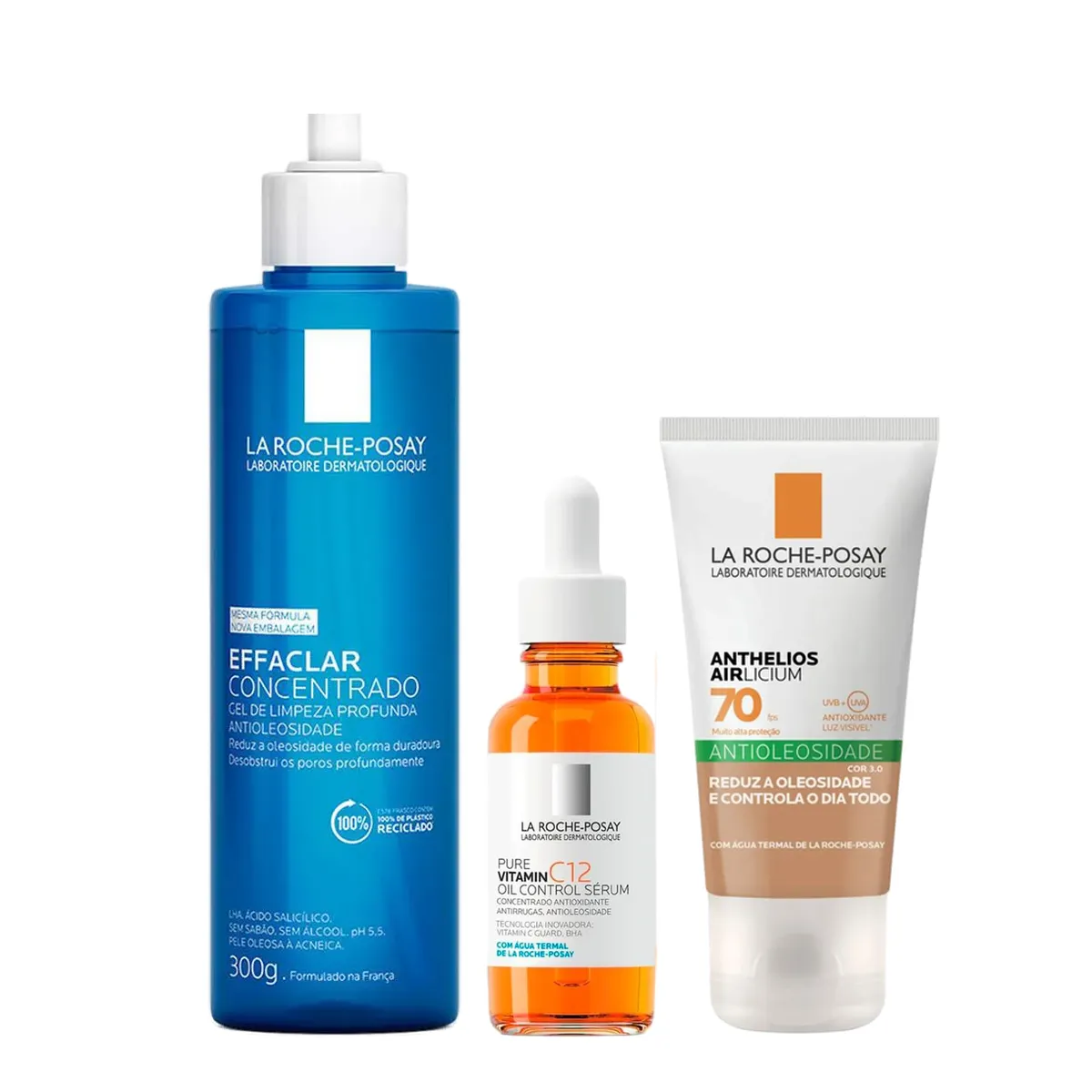 Kit La Roche-Posay Gel de Limpeza Facial Concentrado Effaclar para Pele Oleosa 300g + Sérum Facial Anti-Rugas Pure Vitamin C12 Oil Control 30ml + Protetor Solar Facial Anthelios Airlicium FPS 70 Cor 3.0 40g