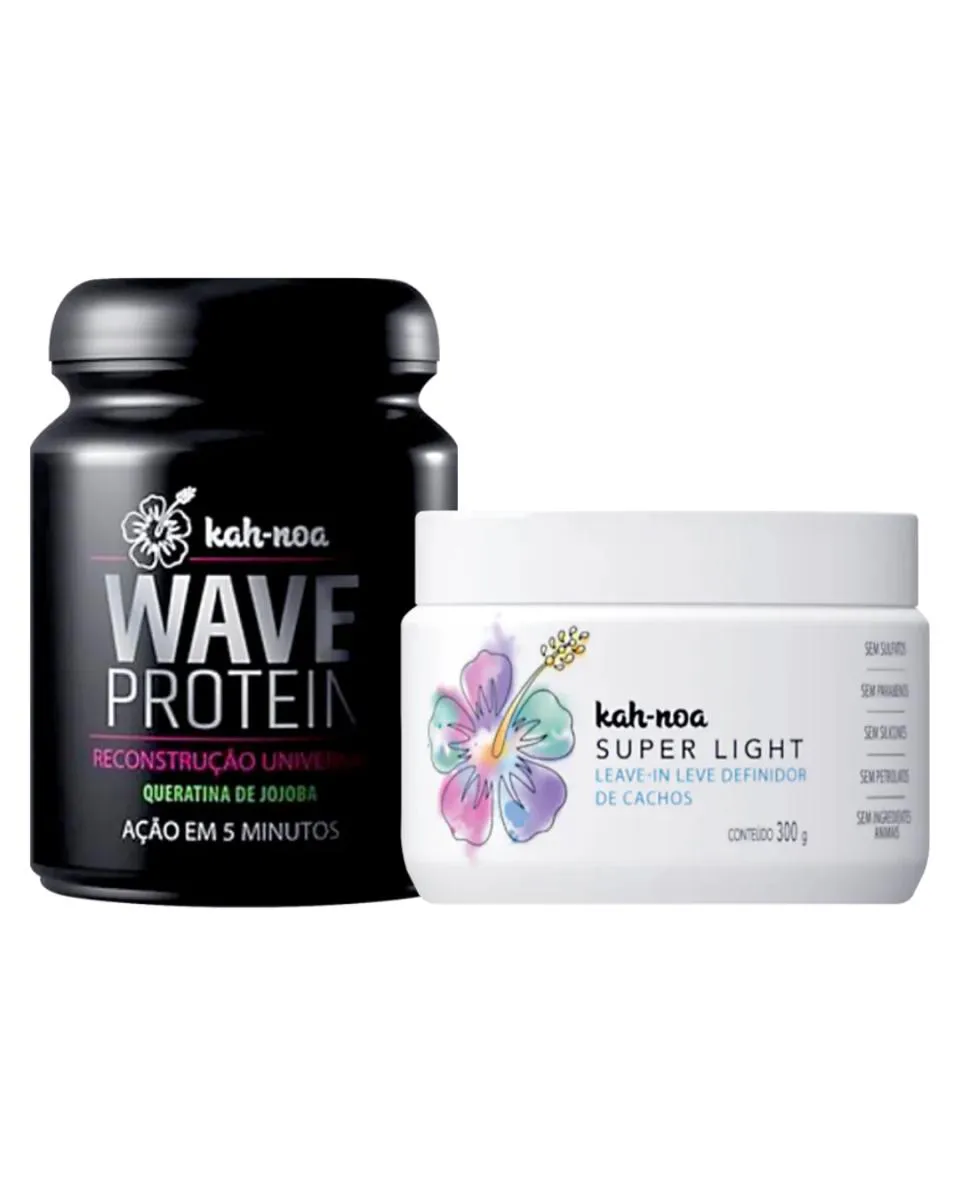 Kit Super Light e Wave Protein Kah-Noa Contém: 01 Leave-in Super Light 300g (Queridinho das blogueiras, caimento leve e natural dos cachos) 01 máscara Reconstrutora Wave Protein 300g (Reconstrução hidratante, ativa em 5 minutos!)