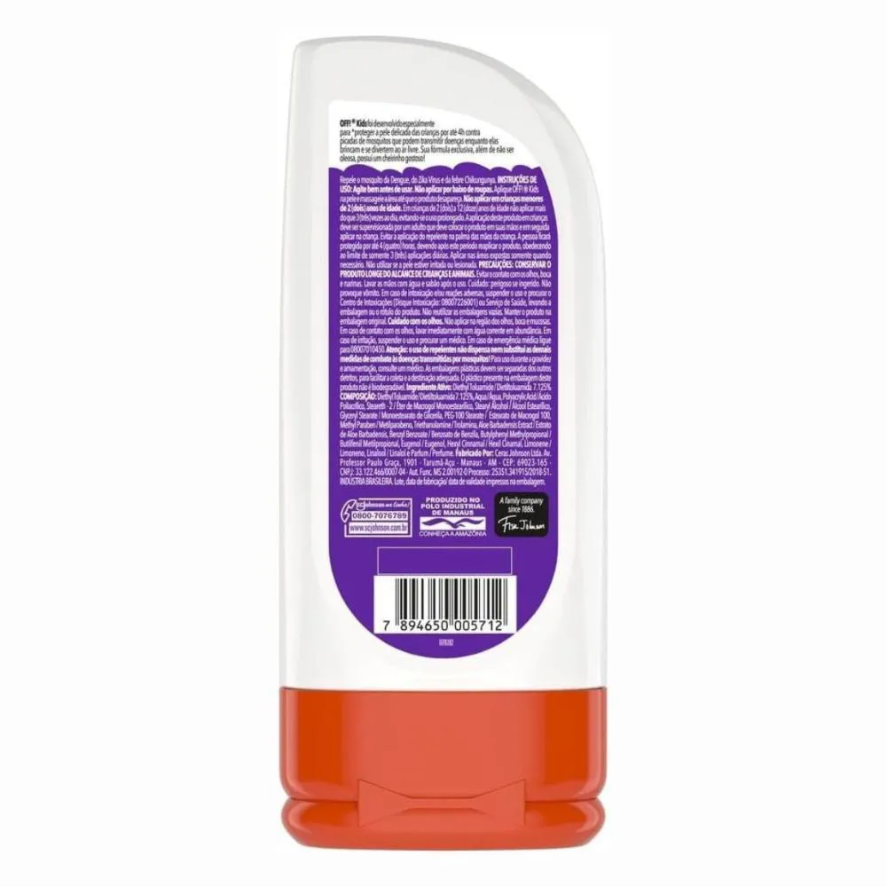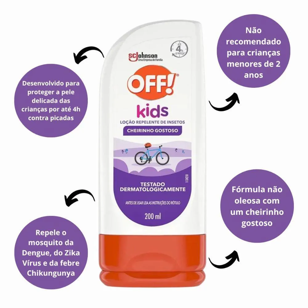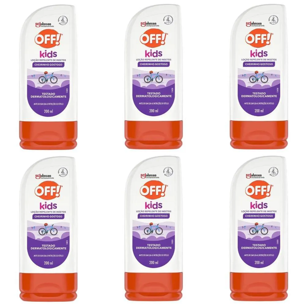 Contém: - 06 Loções repelentes de Insetos Johnson Off! Kids 200ml. . Loção Repelente de Insetos Kids O Repelente de Insetos foi desenvolvido especialmente para proteger a pele delicada das crianças por até 4h contra picadas de mosquitos que podem tansmitir doenças. Sua fórmula exclusiva, além de não ser oleosa, possui um cheirinho gostoso! Repele o mosquito da Dengue, do Zika Vírus e da febre Chikungunya. Testado Dermatologicamente. Não recomendado para crianças menores de 2 anos. . Modo de Uso Agitar bem antes de usar, aplique pelo corpo nas áreas que pretende proteger. Em seguida, massageie a área até espalhar completamente. . Composição Dietiltoluamida, água, acido poliacrilico, eter de macrogol monoestearilico, alcool estearilico, glyceryl stearate, estearato de macrogol 100, metilparabeno, trolamina, extrato de aloe barbadensis, benzoato de benzila, butifenil metilpropional, eugenol, hexil, cinnal, limonene, linaloool, perfume.