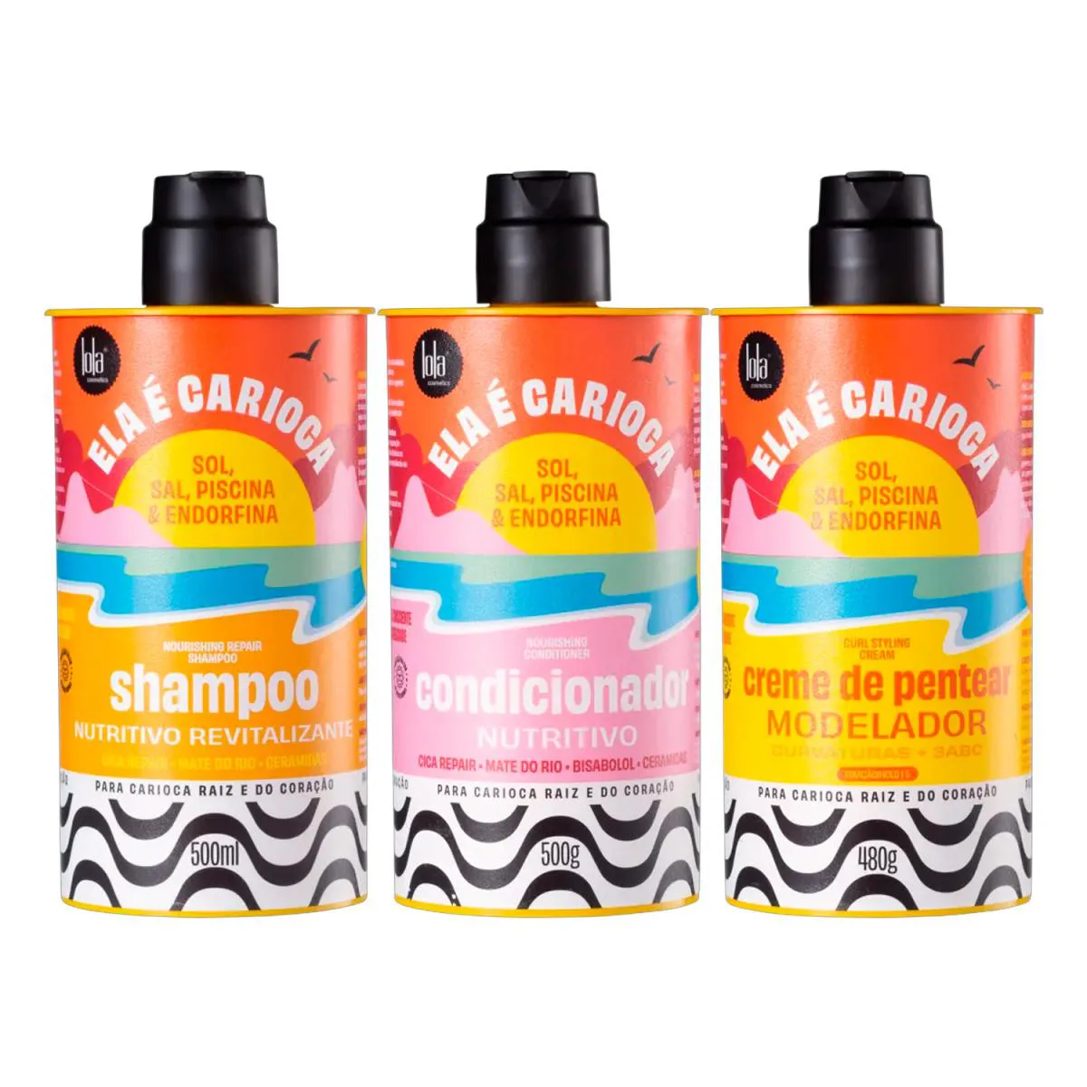 O kit é composto por três produtos capilares da linha Ela É Carioca da marca Lola Cosmetics, desenvolvidos para cuidado e tratamento capilar completo.