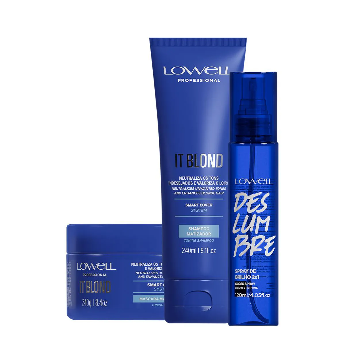 cabelo com sua alta concentração de pigmentos violetas acinzentados hidratantes, além de matizar os fios. Lowell Deslumbre - Spray de Brilho 2x1 120ml: oferece uma finalização perfeita do penteado. Com ele, seu visual ganha um brilho incrível e fica protegido dos maus odores causados pela poluição, cigarros, entre outros. Seu cabelo fica com um brilho intenso e levemente perfumado. Conselho de Aplicação Shampoo: com os cabelos limpos e úmidos, aplique o shampoo massageando o couro cabeludo e espalhando pelo comprimento dos cabelos. Enxague completamente. Máscara: com ajuda de uma espátula, para evitar contaminação do produto, pegue uma quantidade e aplique com as