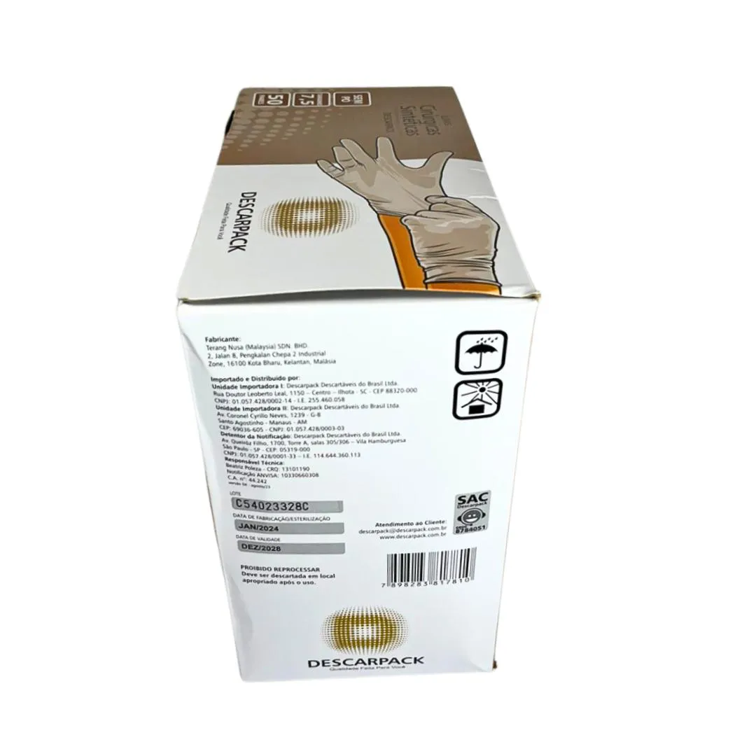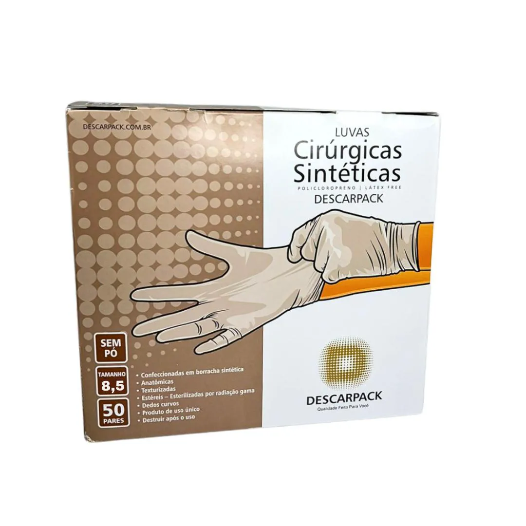 Luvas Sintéticas Cirúrgicas de Policloropreno Descarpack As Luvas Sintéticas Cirúrgicas de Policloropreno estéreis da marca Descarpack são projetadas para oferecer máxima segurança, conforto e precisão em procedimentos cirúrgicos exigentes. Fabricadas sem pó e sem látex, são ideais para profissionais de saúde que buscam minimizar o risco de reações alérgicas, garantindo proteção tanto para o usuário quanto para o paciente. Feitas de policloropreno, um material sintético de alta qualidade, essas luvas proporcionam elasticidade superior e resistência à perfuração. Com um ajuste anatômico perfeito, as luvas oferecem conforto prolongado e excelente sensibilidade tátil, essencial para procedimentos que requerem precisão. Elas são estéreis, assegurando uma barreira eficaz contra agentes biológicos e minimizando o risco de contaminação. Produzidas seguindo normas rigorosas de qualidade e segurança internacionais, as Luvas de Policloropreno Descarpack possuem registro ANVISA nº 10330660308, garantindo sua conformidade para uso no Brasil. As luvas se adaptam perfeitamente às mãos de cada profissional, proporcionando um ajuste seguro e confortável sem comprometer a liberdade de movimento,oferecendo uma solução prática e econômica para ambientes que demandam alto consumo de luvas, como hospitais, clínicas, laboratórios e consultórios. O design sem pó dessas luvas não só reduz o risco de irritação e contaminação, como também promove um ambiente mais limpo e seguro, essencial para o controle de infecções. A combinação de alta resistência, ajuste anatômico e sensibilidade tátil faz das Luvas de Policloropreno Descarpack uma escolha ideal para profissionais que buscam qualidade, segurança e confiabilidade. Com sua capacidade de oferecer proteção superior e conforto excepcional, essas luvas são essenciais para quem atua na área da saúde, onde a precisão e a segurança são fundamentais. Disponíveis nos tamanhos 6,5; 7,0; 7,5; 8,0; e 8,5 Cada caixa contém 50 pares (100 unidades) Registro ANVISA: 10330660308