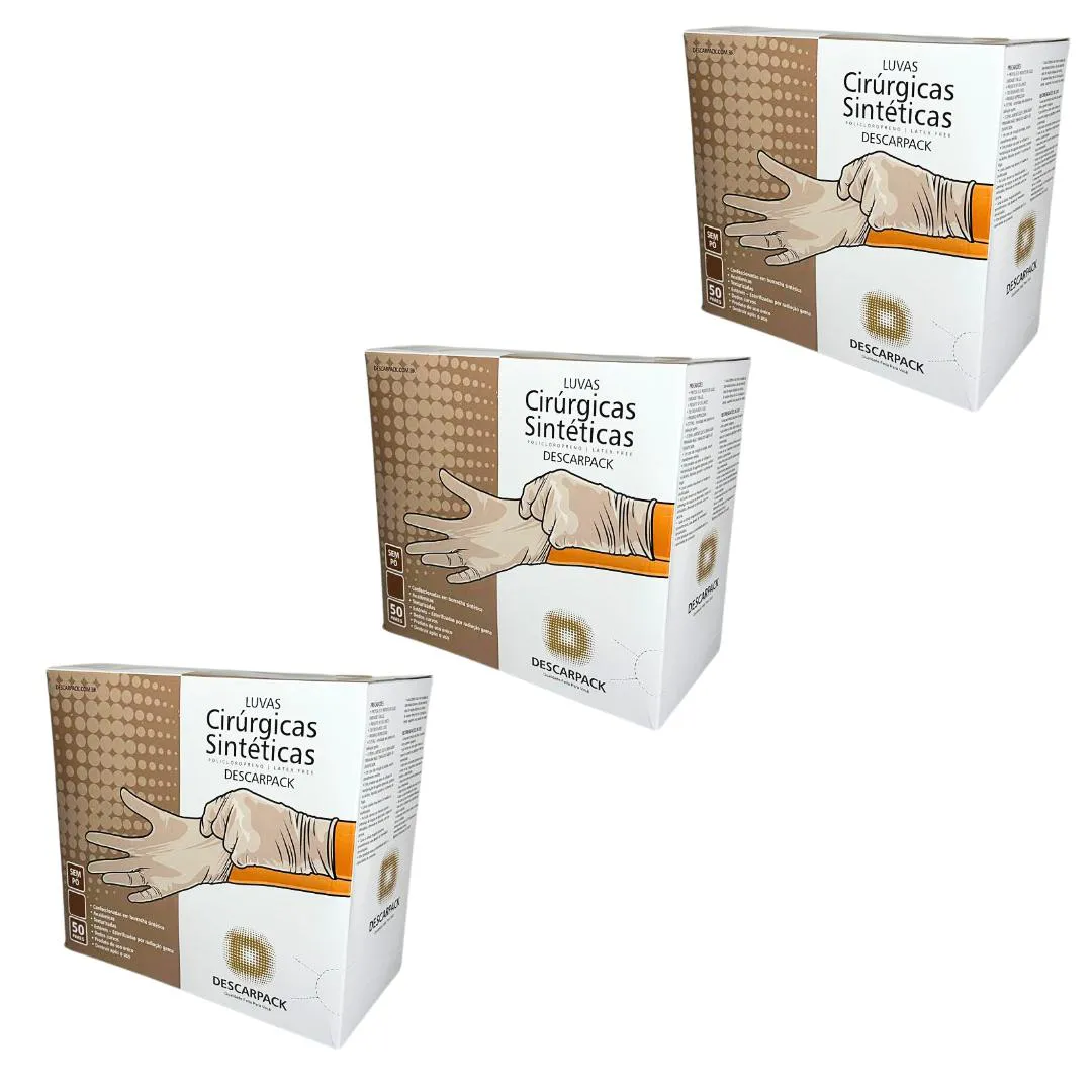 Luvas Sintéticas Cirúrgicas de Policloropreno Descarpack As Luvas Sintéticas Cirúrgicas de Policloropreno estéreis da marca Descarpack são projetadas para oferecer máxima segurança, conforto e precisão em procedimentos cirúrgicos exigentes. Fabricadas sem pó e sem látex, são ideais para profissionais de saúde que buscam minimizar o risco de reações alérgicas, garantindo proteção tanto para o usuário quanto para o paciente. Feitas de policloropreno, um material sintético de alta qualidade, essas luvas proporcionam elasticidade superior e resistência à perfuração. Com um ajuste anatômico perfeito, as luvas oferecem conforto prolongado e excelente sensibilidade tátil, essencial para procedimentos que requerem precisão. Elas são estéreis, assegurando uma barreira eficaz contra agentes biológicos e minimizando o risco de contaminação. Produzidas seguindo normas rigorosas de qualidade e segurança internacionais, as Luvas de Policloropreno Descarpack possuem registro ANVISA nº 10330660308, garantindo sua conformidade para uso no Brasil. As luvas se adaptam perfeitamente às mãos de cada profissional, proporcionando um ajuste seguro e confortável sem comprometer a liberdade de movimento,oferecendo uma solução prática e econômica para ambientes que demandam alto consumo de luvas, como hospitais, clínicas, laboratórios e consultórios. O design sem pó dessas luvas não só reduz o risco de irritação e contaminação, como também promove um ambiente mais limpo e seguro, essencial para o controle de infecções. A combinação de alta resistência, ajuste anatômico e sensibilidade tátil faz das Luvas de Policloropreno Descarpack uma escolha ideal para profissionais que buscam qualidade, segurança e confiabilidade. Com sua capacidade de oferecer proteção superior e conforto excepcional, essas luvas são essenciais para quem atua na área da saúde, onde a precisão e a segurança são fundamentais. Disponíveis nos tamanhos 6,5; 7,0; 7,5; 8,0; e 8,5 Cada caixa contém 50 pares (100 unidades) Registro ANVISA: 10330660308