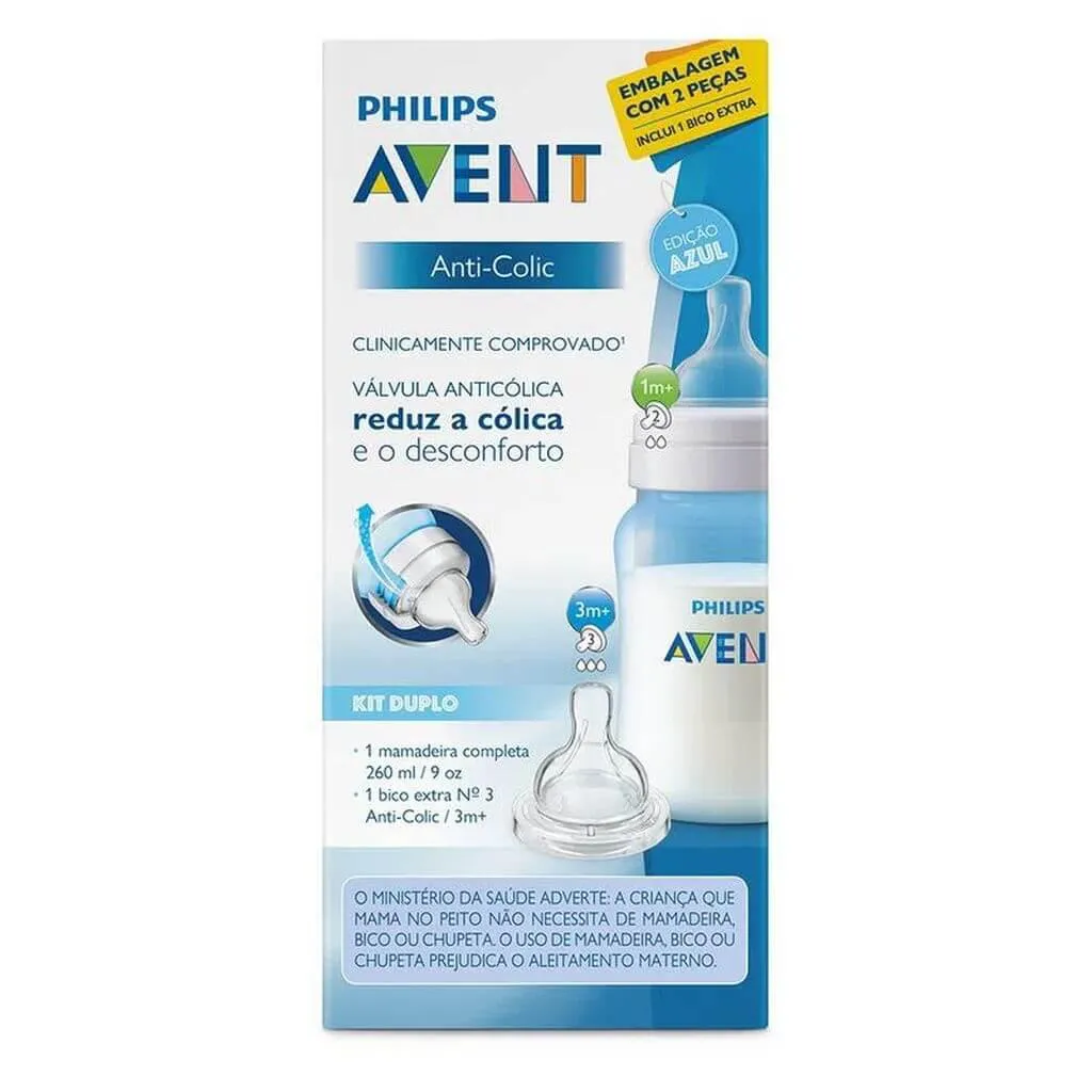 Kit Mamadeira Anti-Colic 260ml + Bico 3 - Philips AventBRBRO Kit Mamadeira Anticólica 260ml com Bico nº 3 da Philips Avent é projetado para proporcionar uma alimentação mais confortável e segura para o seu bebê.BRBRCaracterísticas Principais:BR• Sistema Anticólico: A válvula exclusiva do bico flexiona-se conforme o ritmo de sucção do bebê, diminuindo a ingestão de ar e, consequentemente, as cólicas e desconfortos, especialmente durante a noite.BR• Fácil de Usar e Limpar: Com gargalo largo e poucas peças, a mamadeira é simples de montar e limpar, garantindo praticidade no dia a dia.BR• Design Ergonômico: O formato facilita que o bebê proteja a mamadeira com conforto e segurança.BR• Compatibilidade: Compatível com grande parte da linha Philips Avent, recomenda-se o uso com bicos da linha Anti-Colic (Clássica) para melhor desempenho.BRBREspecificações Técnicas:BR• Capacidade: 260 mlBR• Material: Polipropileno (PP) livre de Bisfenol-A (BPA)BR• Idade Recomendada: A partir de 3 mesesBR• Dimensões da Mamadeira: 16 cm de altura x 7 cm de larguraBR• Peso da Mamadeira: 0,08 kgBR• Conteúdo da Embalagem: 1 mamadeira de 260 ml com bico nº 3 Anti-Cólicas e 1 bico extra nº 3 Anti-CólicaBRBREste kit é ideal para pais que buscam reduzir as cólicas e proporcionar uma alimentação mais tranquila para seus bebês.