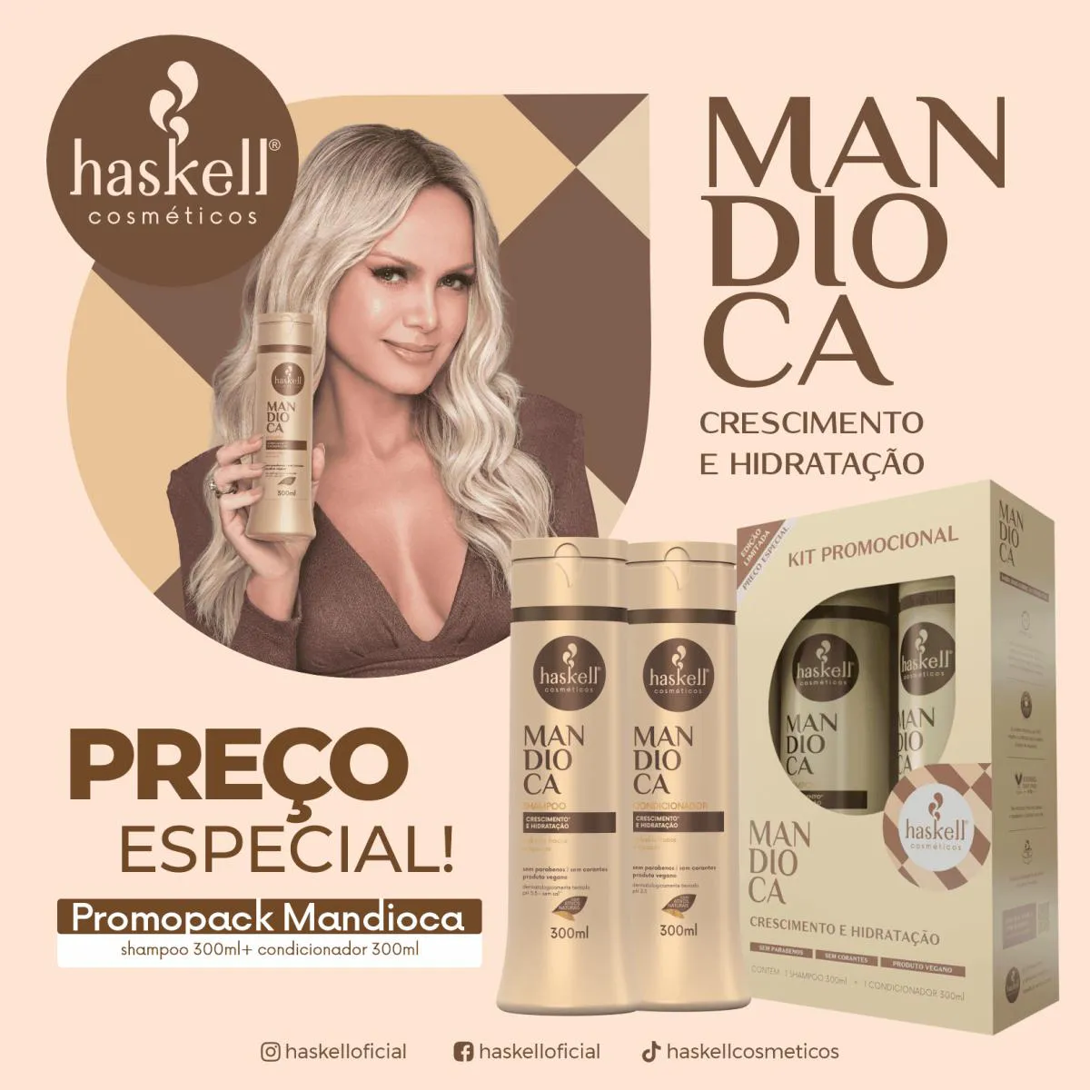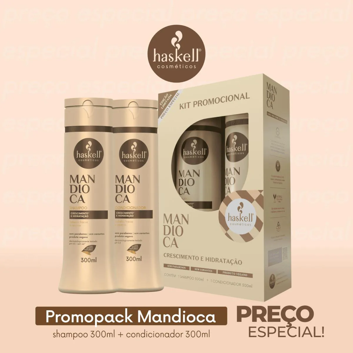 O Kit Mandioca da Haskell é um conjunto de produtos capilares composto por shampoo e condicionador, desenvolvido com extrato de mandioca, vitaminas A e C, e minerais essenciais para cuidado capilar.