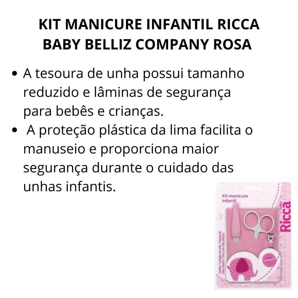 Kit Manicure Ricca infantil é composto por 1 Tesoura, 1 Lixa de unha, com cabo plástico resistente e lâminas em aço inox, 1 Cortador de unha infantil, em tamanho adequado para as delicadas mãos dos bebês, ideal para ser levado a qualquer lugar. A Ricca é uma das marcas da Belliz que detém marcas importantes em seu portfólio como Prada, Vertix, Ricca, Enox, Basics Accessories, Kess e Clia. Belliz está mudando sua marca corporativa para Belliz Company, reforçando assim seu posicionamento como uma empresa que oferece produtos de beleza para diferentes públicos. Contém: - 1 Lima com cabo de plástico - 1 Tesoura de unha infantil - 1 Cortador . Composição Tesoura: aço inox. Lima: aço inox e polipropileno. Cortador de unha: aço cromado e polipropileno.