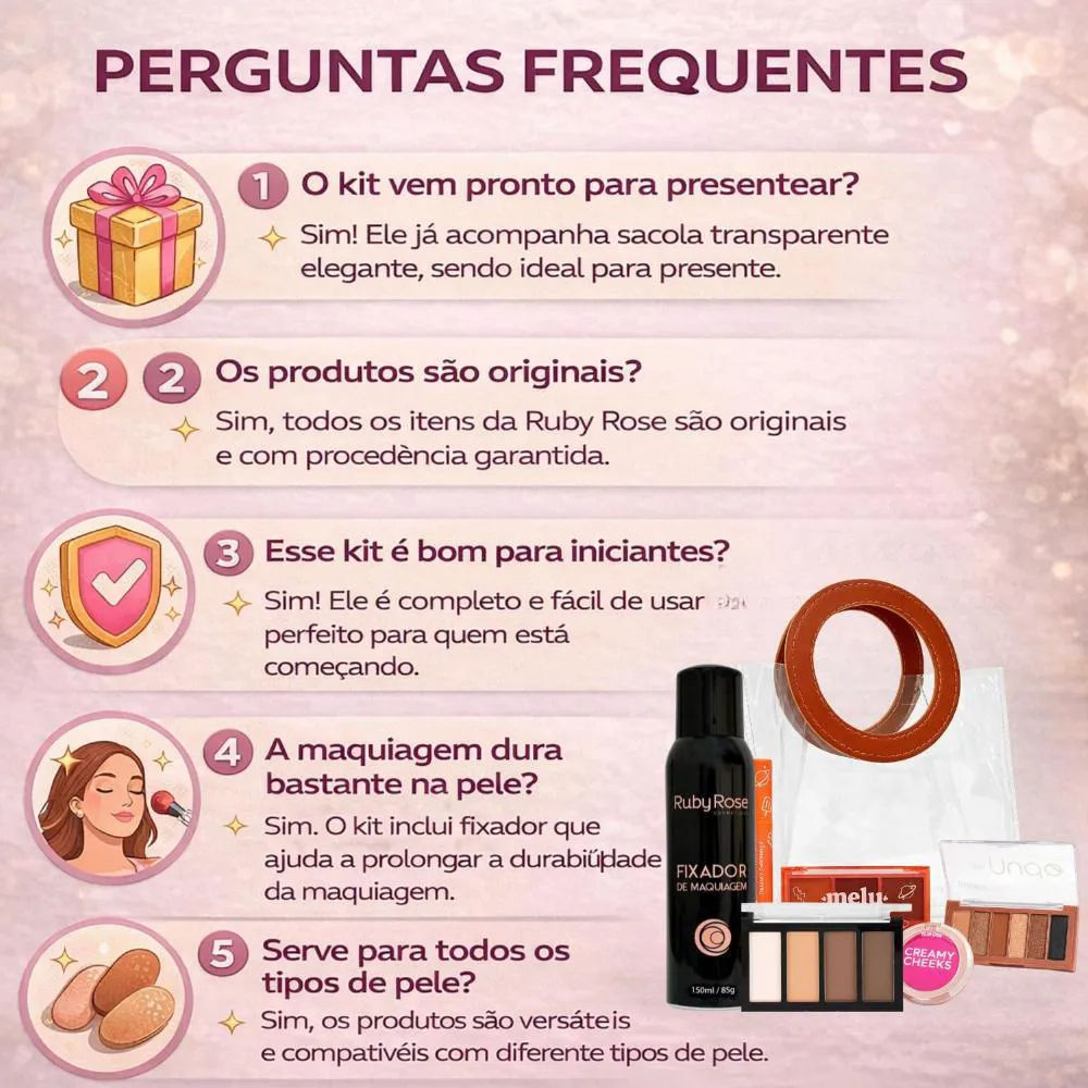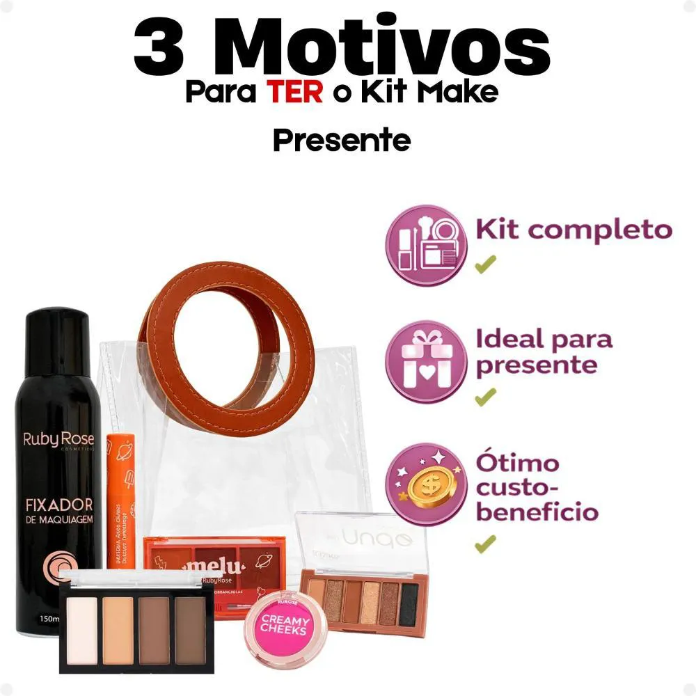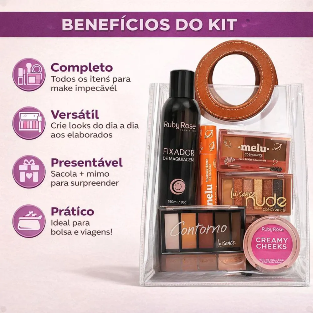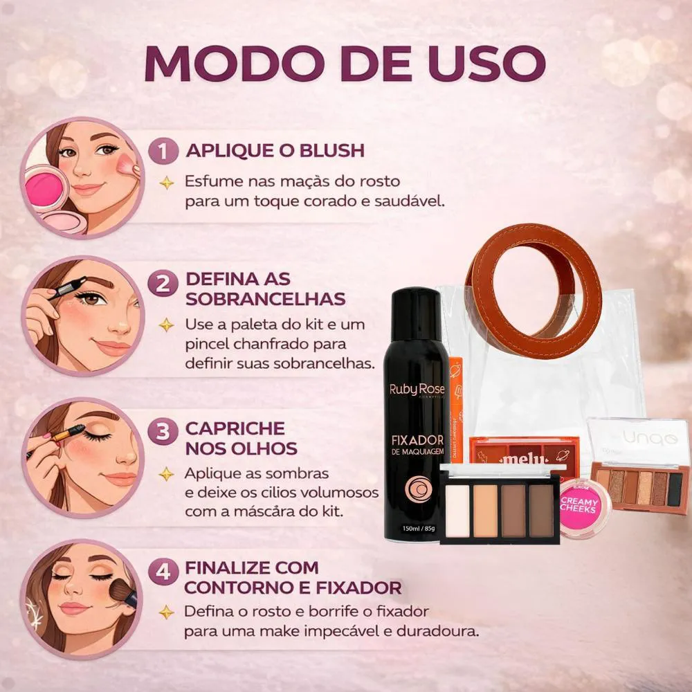 - Facilita a rotina de beleza com itens essenciais em um só kit, otimizando o espaço na sua nécessaire e tornando a maquiagem mais prática e rápida.