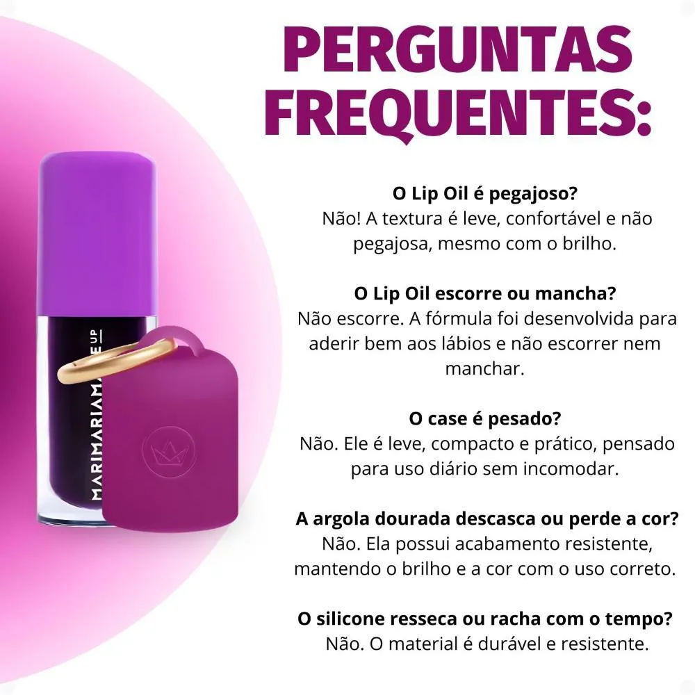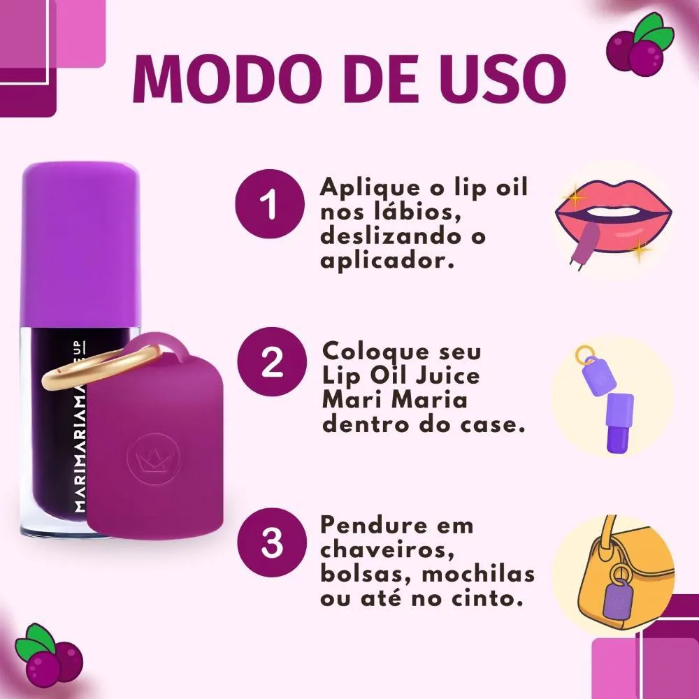 Case: Basta inserir seu lip oil Juice na Case Mari Maria Make Up . Utilize a argola dourada para pendurar o case em chaveiros, bolsas, alças ou até no cinto, garantindo que seu lip oil esteja sempre por perto e pronto para ser usado.Lip Oil Juice: Aplique o Lip Oil Juice Açaí diretamente sobre os lábios, deslizando o aplicador para uma cobertura uniforme e um brilho instantâneo.Anvisa Lip Juice Açaí: 25351050566/2025-90