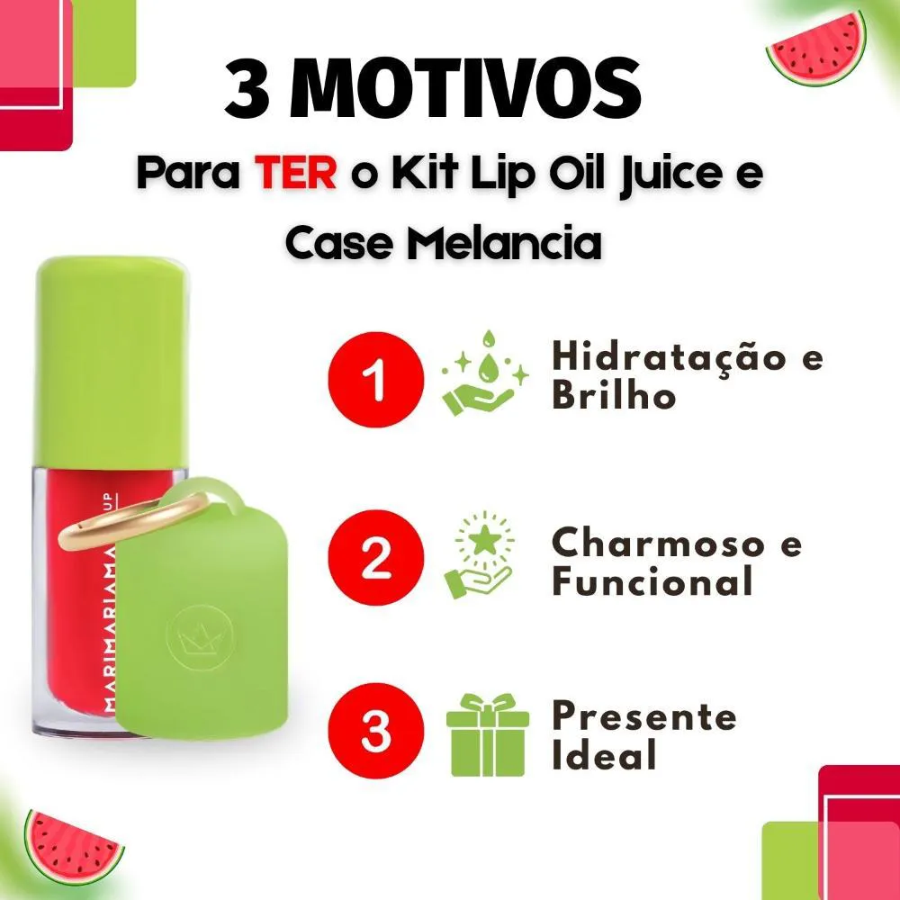 O kit é composto por um Lip Oil Juice de melancia e uma case, desenvolvido pela marca Mari Maria Makeup para cuidado e embelezamento labial. Trata-se de um conjunto de produto cosmético destinado à hidratação, proteção e realce dos lábios, oferecendo um brilho sutil e natural com aroma de melancia.