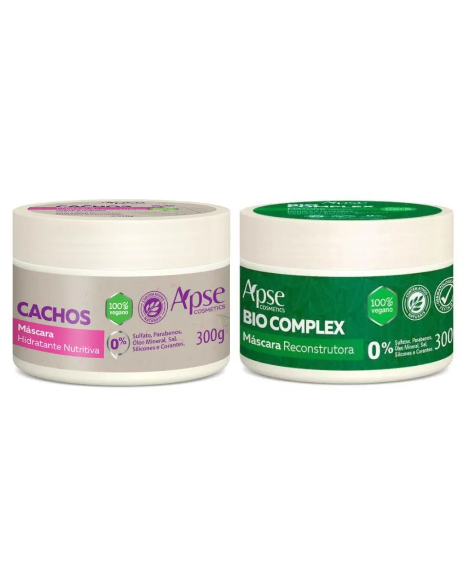 O kit é composto por duas máscaras capilares: uma máscara Cachos Hidratante Nutritiva e uma Máscara Bio Complex Reconstrução, ambas com 300g cada.