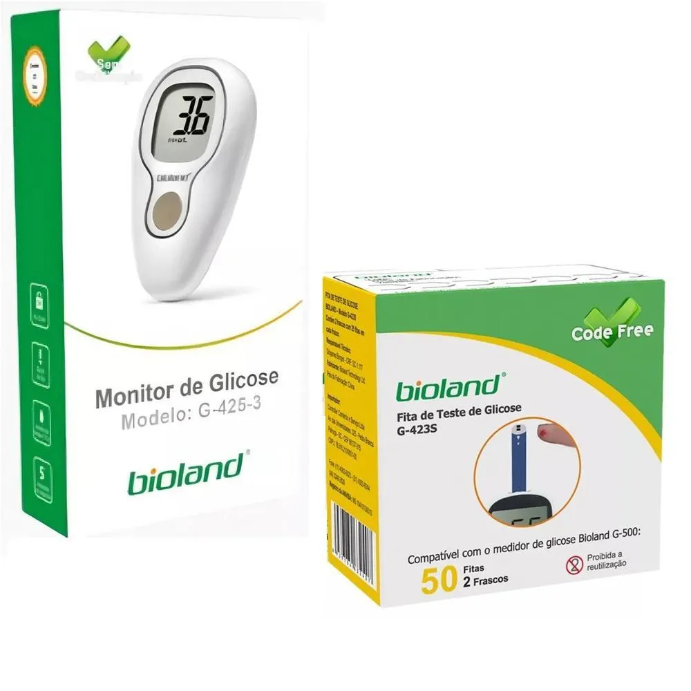 Medidor de glicose G-425-3 Bioland Glicosímetro + Caixa 50 Fitas * Obtenha controle e tranquilidade com o Glicosímetro Bioland G-425-3.* Projetado para fornecer medições de glicose no sangue precisas e confiáveis* Dispositivo avançado oferece resultados rápidos em apenas 5 segundos.* Memória para 500 medições Glicosímetro Bioland G-425-3 permite que você acompanhe seu progresso ao longo do tempo, contribuindo para um melhor gerenciamento e uma vida mais saudável.Calibrado com plasmas padrões para garantir precisão, este glicosímetro é uma ferramenta essencial para o monitoramento regular da glicose, ajudando a reduzir o risco de complicações.