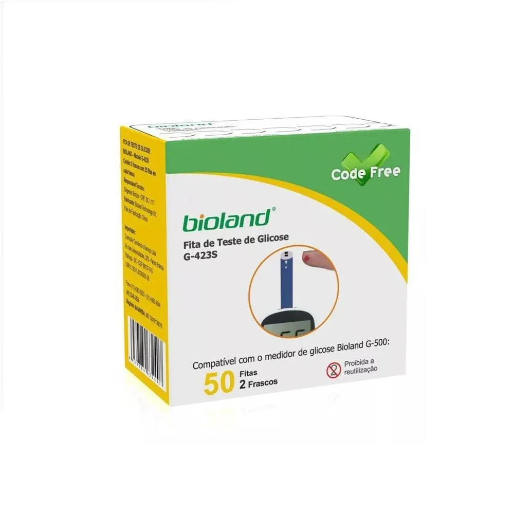 Caixa 50 fitas para mediçãoA Fita para medição de Glicose G-423S da BIOLAND é destinada para medição de glicose em conjunto com o aparelho Bioland G-500. Com uma enzima de alta precisão, esta fita não necessita codificação (antigo chip) e possui um exclusivo indicador de oxidação do pote (patente requerida). Sua reutilização é proibida.* Diagnóstico em vitro