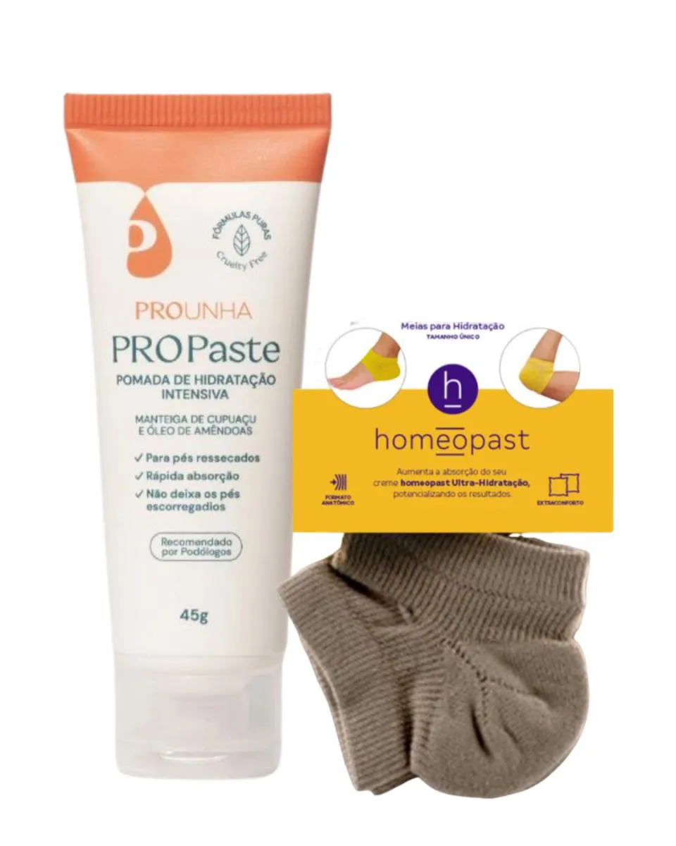 O kit é composto por um creme hidratante (PROPaste) e uma meia especial para hidratação, desenvolvido para cuidar e hidratar intensivamente os pés, especialmente calcanhares ressecados ou com fissuras.