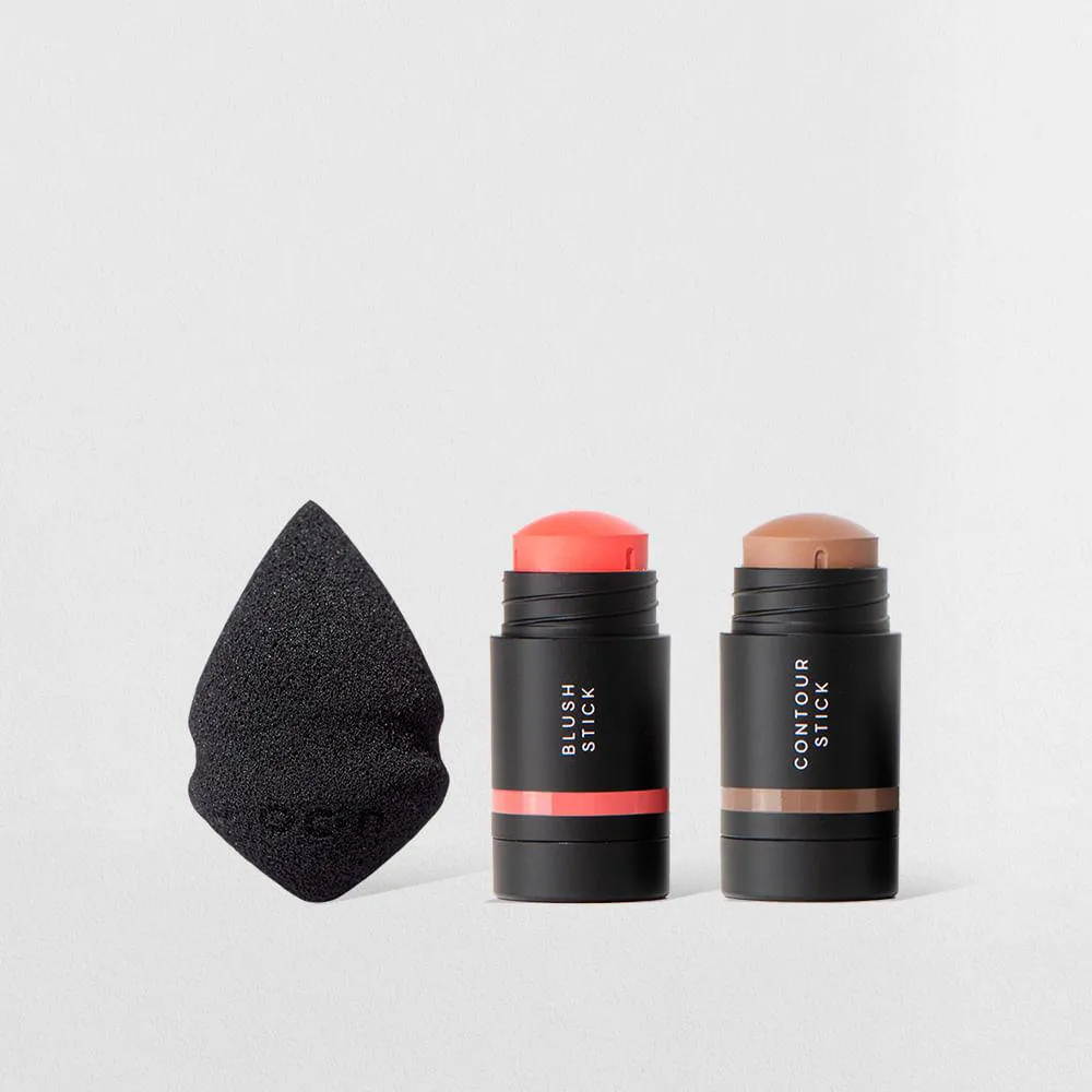 Kit Mini Blush em Bastão Coral + Mini Contorno em Bastão Marrom Médio + Mini Esponja de Maquiagem Océane Edition (3 Produtos)