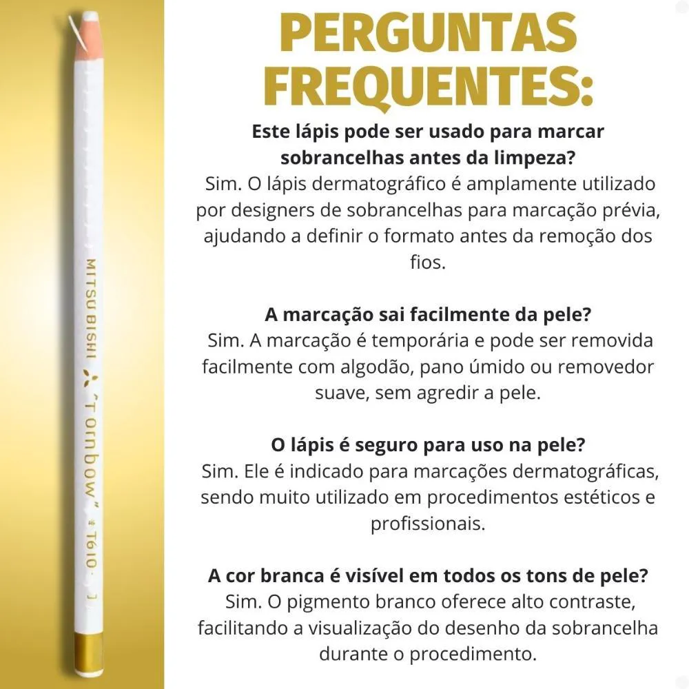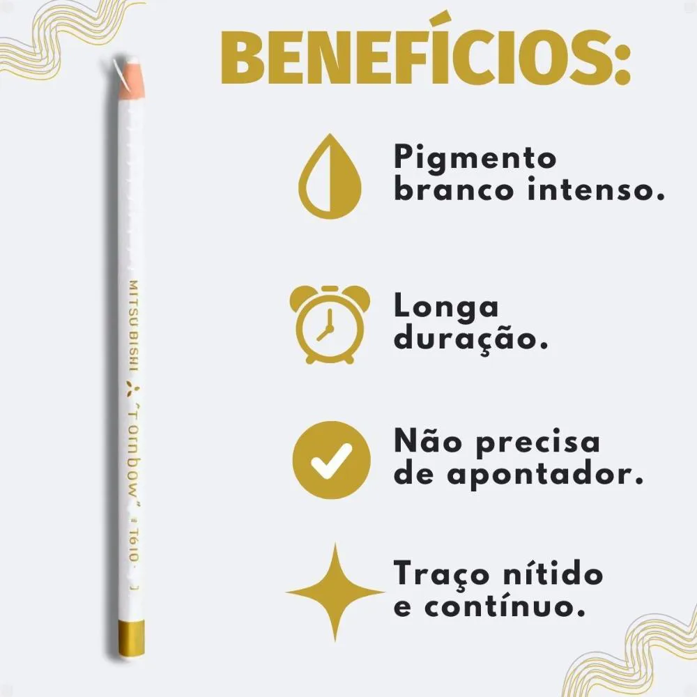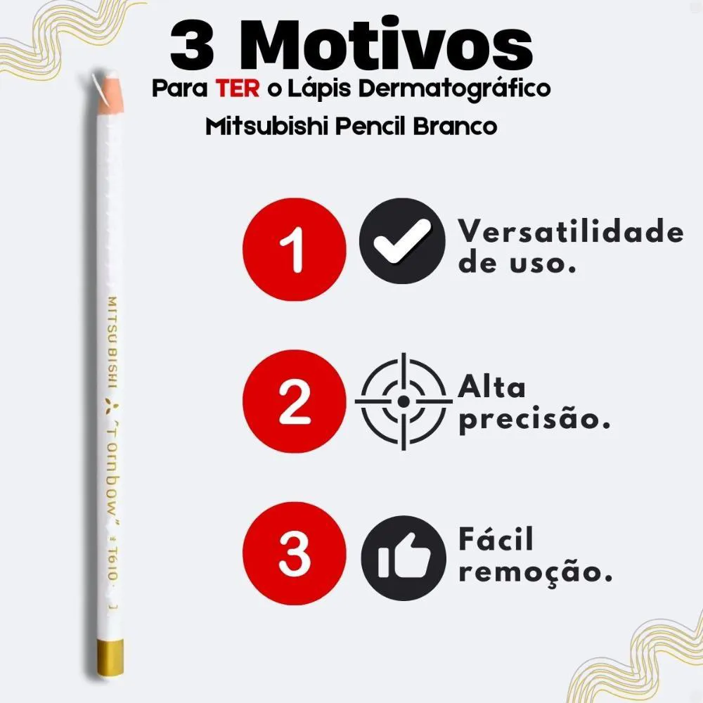 Contém: - 03 Lápis Dermatográfico Mitsubishi Rainbow Branco 7610-1. Descubra a precisão e versatilidade do Lápis Dermatográfico Mitsubishi Rainbow Branco 7610-1, uma ferramenta indispensável para quem busca marcações claras e duradouras em diversas superfícies. Desenvolvido pela renomada marca MITSUBISHI, este lápis não só atende, mas supera as expectativas de profissionais que necessitam de um traço visível e confiável. Imagine a frustração de marcações imprecisas que comprometem seu trabalho; este lápis resolve esse problema, oferecendo precisão e durabilidade. Ideal para artistas, profissionais de estética e técnicos, o Lápis Dermatográfico Mitsubishi Rainbow Branco 7610-1 garante que suas marcações sejam sempre nítidas e confiáveis, elevando a qualidade do seu trabalho.Benefícios Principais