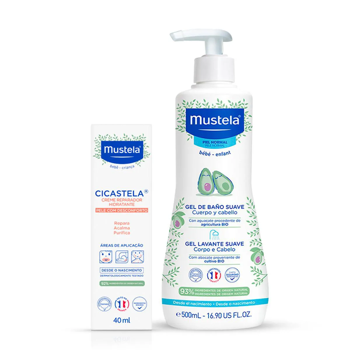 Cicastela é o creme multiuso da Mustela que repara, hidrata e acalma a pele sensível do bebê. Seu uso é eficaz em pequenas feridas, ressecamento e serve também como protetor contra assaduras. É composto por 91% de ingredientes de origem natural, entre eles: Perseose de Abacate, Ácido hialurônico, Pantenol e Cobre-Zinco. Cicastela foi desenvolvido para cuidar da pele sensível do bebê e da criança, reparando e acalmando qualquer desconforto. Pode ser aplicado nos lábios, contorno da boca, região das dobras, picadas de insetos, vermelhidão na área da fralda e áreas sensibilizadas. Gel Lavante Mustela Bebê Suave Corpo e Cabelo é um sabonete líquido sem sabão, feito com 93% de ingredientes naturais, ideal para banhar o seu bebê de forma mais natural e saudável desde o nascimento. Esse produto limpa a pele e os cabelos dele de forma suave e delicada, com fácil enxágue e sem irritar os olhos.