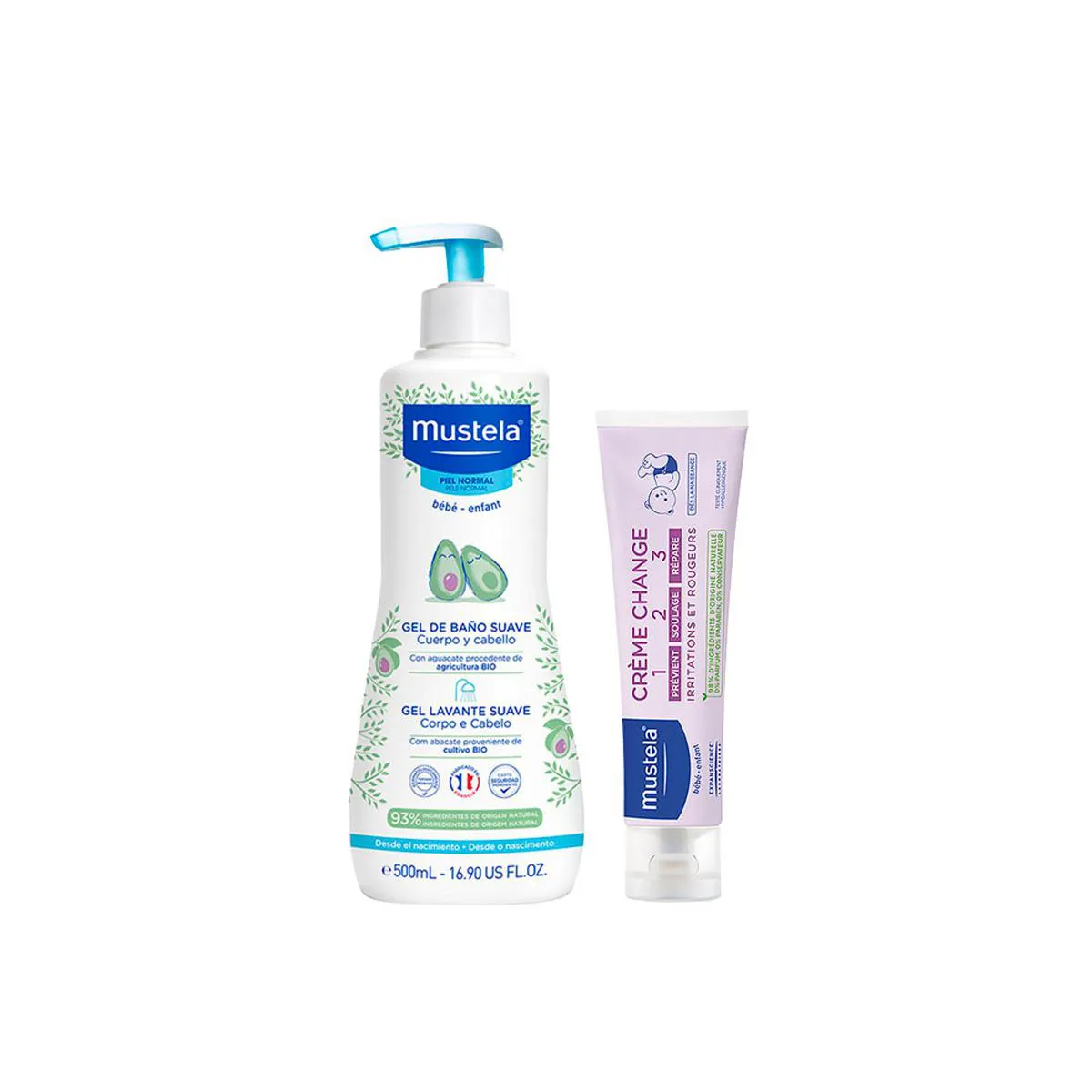 - Kit Mustela Bebê com higiene suave e proteção contra assaduras.