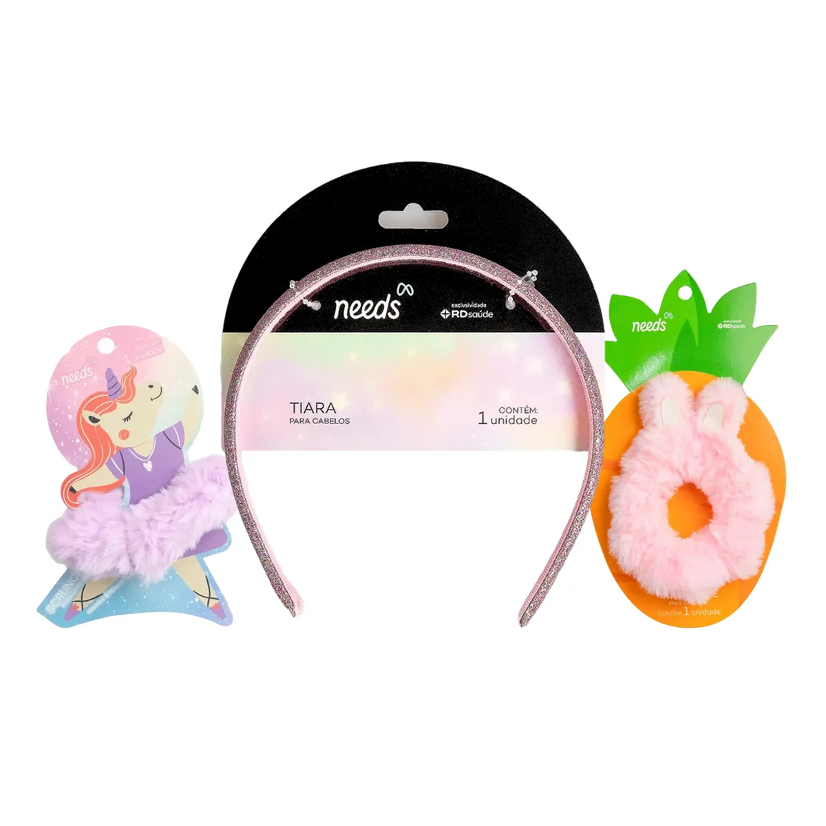 O que é e para que serve o Kit Needs Scrunchie Elástico para cabelo Needs Scrunchie Rosa + Tiara para Cabelo Needs Glitter + Elástico para Cabelo Needs Scrunchie Lilás?